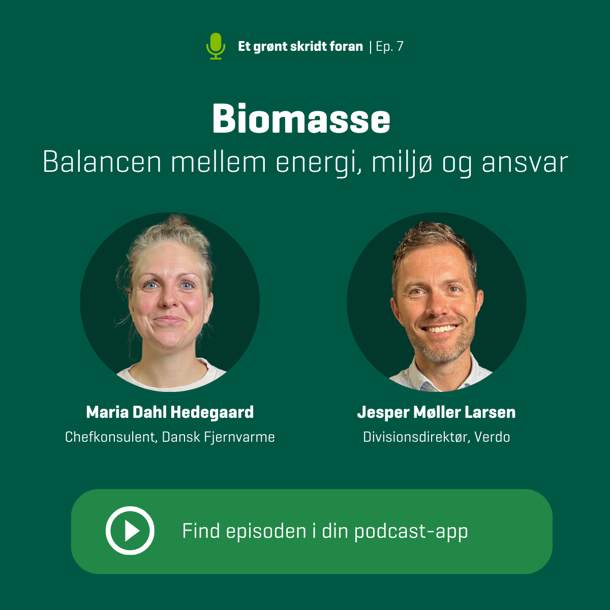Man kan høre Maria Dahl Hedegaard og Jesper Møller Larsen fortælle mere om biomassens rolle i energiforsyningen i Verdo’s podcast ”Et grønt skridt foran”.