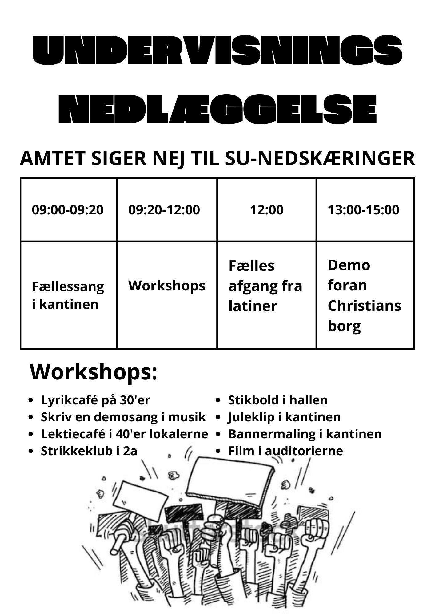 Flere gymnasier nedlægger tirsdag undervisningen for at demonstrere imod regeringens planer om at afskaffe det fleksible SU-år. Dette sker samme dag, som en bred vifte af elev- og studenterorganisationer afholder en demonstration mod SU-nedskæringer foran Folketinget. Dette gælder blandt andet på Roskilde Gymnasium: