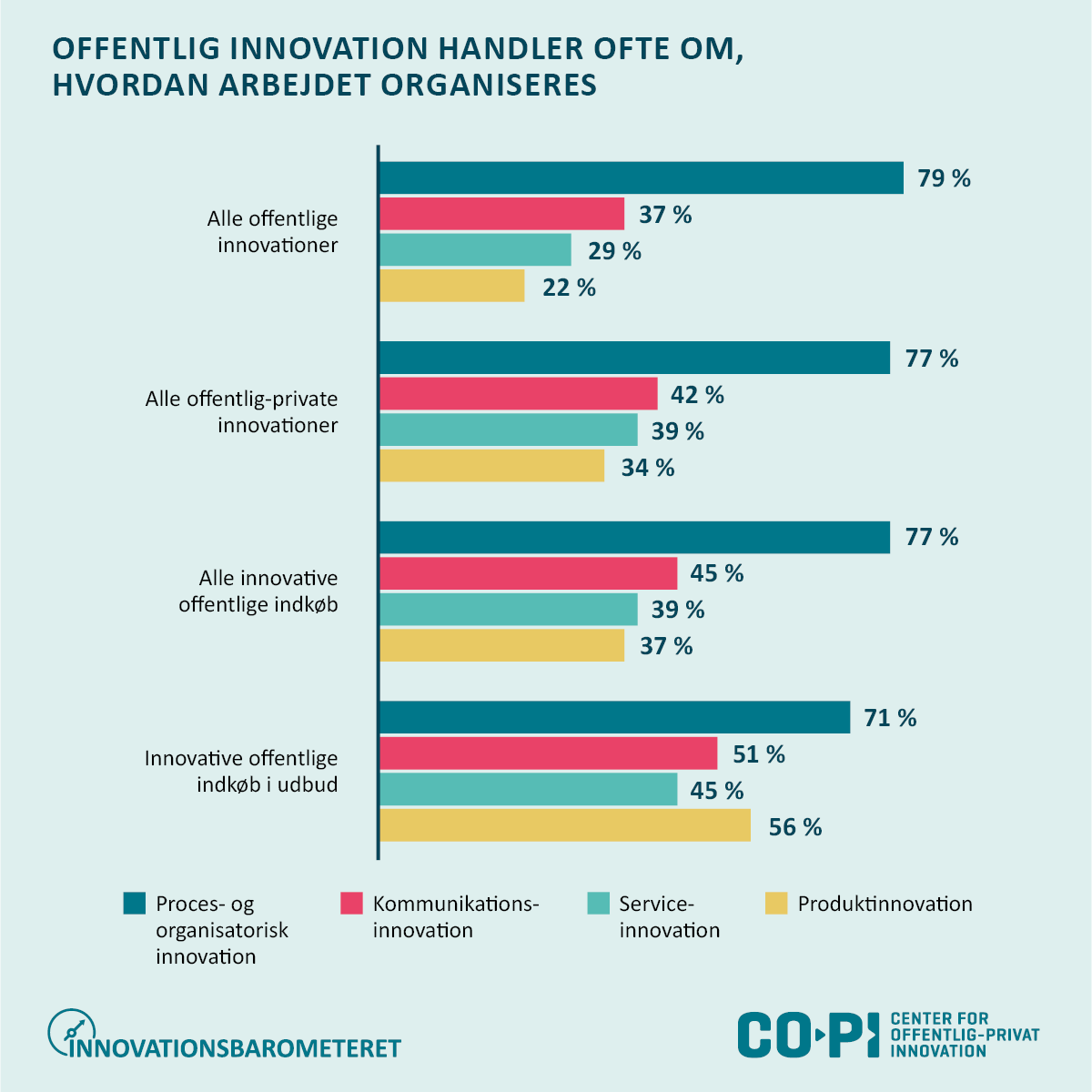 - Offentlig-privat innovation er langt fra kun produkter: 77 procent indeholder proces- og organisatorisk innovation, 42 procent indeholder kommunikationsinnovation, 39 procent indeholder serviceinnovation mens kun 34 procent indeholder produktinnovation.