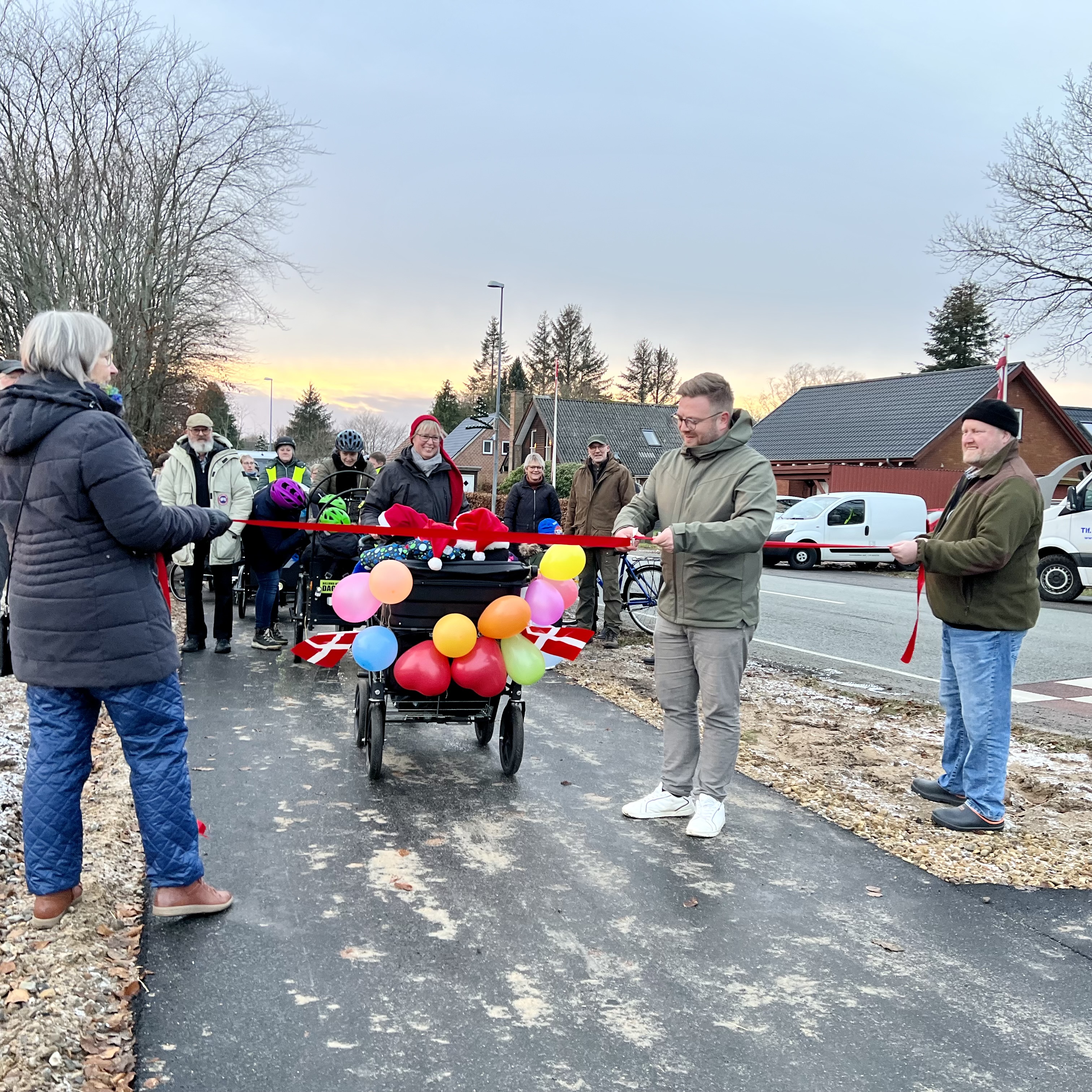 De næsten 100 fremmødte talte flere dagplejemødre med børn i ladcykler og en del lokale borgere, som i det fine, men kolde, vejr varmede sig på æbleskiver, kaffe og kakao, efter at Simon Nicolajsen Jørgensen (S), formand for Billund Kommunes Teknik-, Plan- og Kulturudvalg, først holdt en tale og klippede snoren. Flere havde selv medbragt cykel og kunne efterfølgende afprøve den splinternye asfalt.