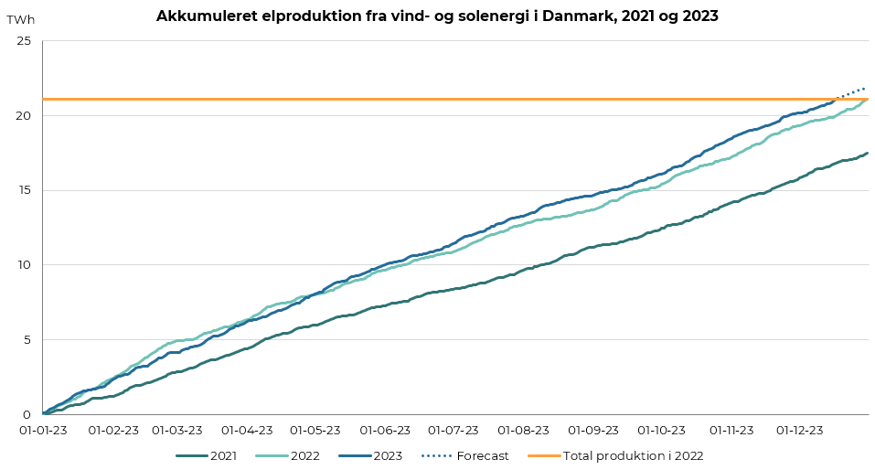 I 2023 er der indtil i dag produceret 21,1 TWh (terrawatt-timer) strøm fra solceller og vindmøller. Det svarer til den samlede produktion af grøn strøm sidste år. Produktionen svarer til 62% af elforbruget.*