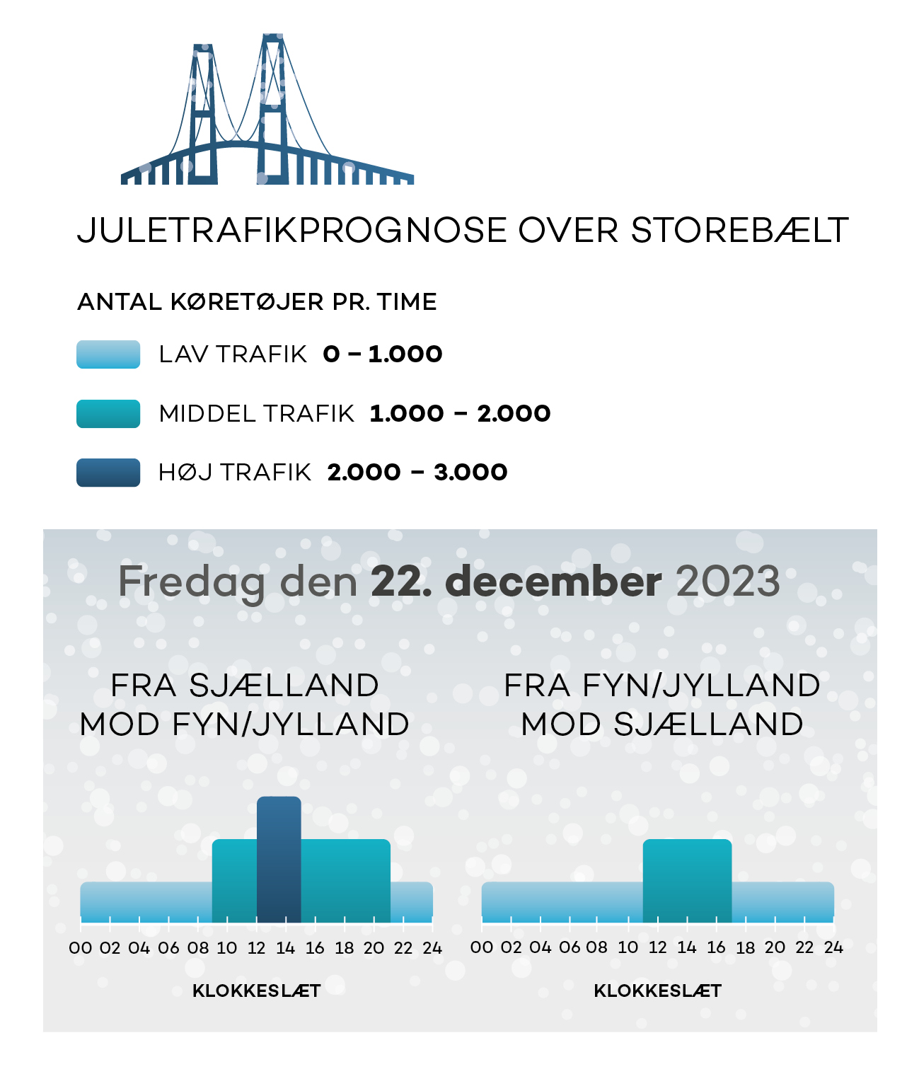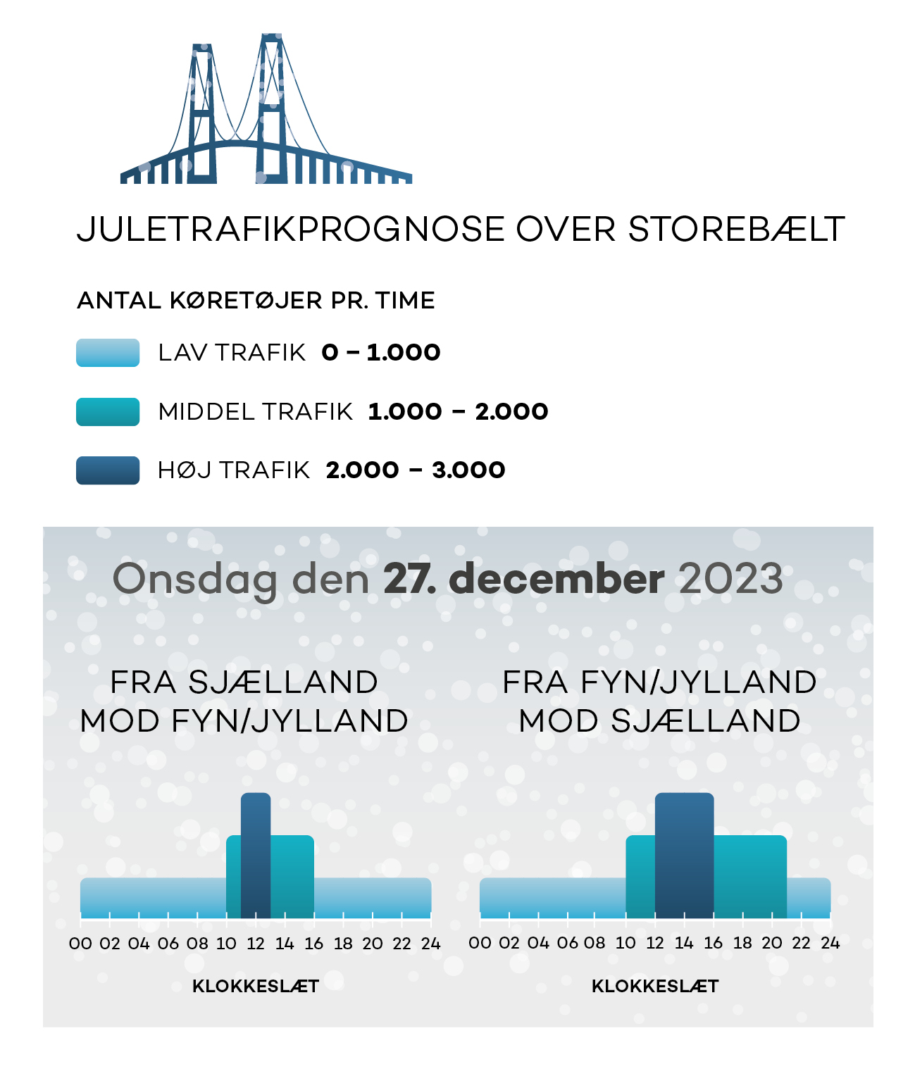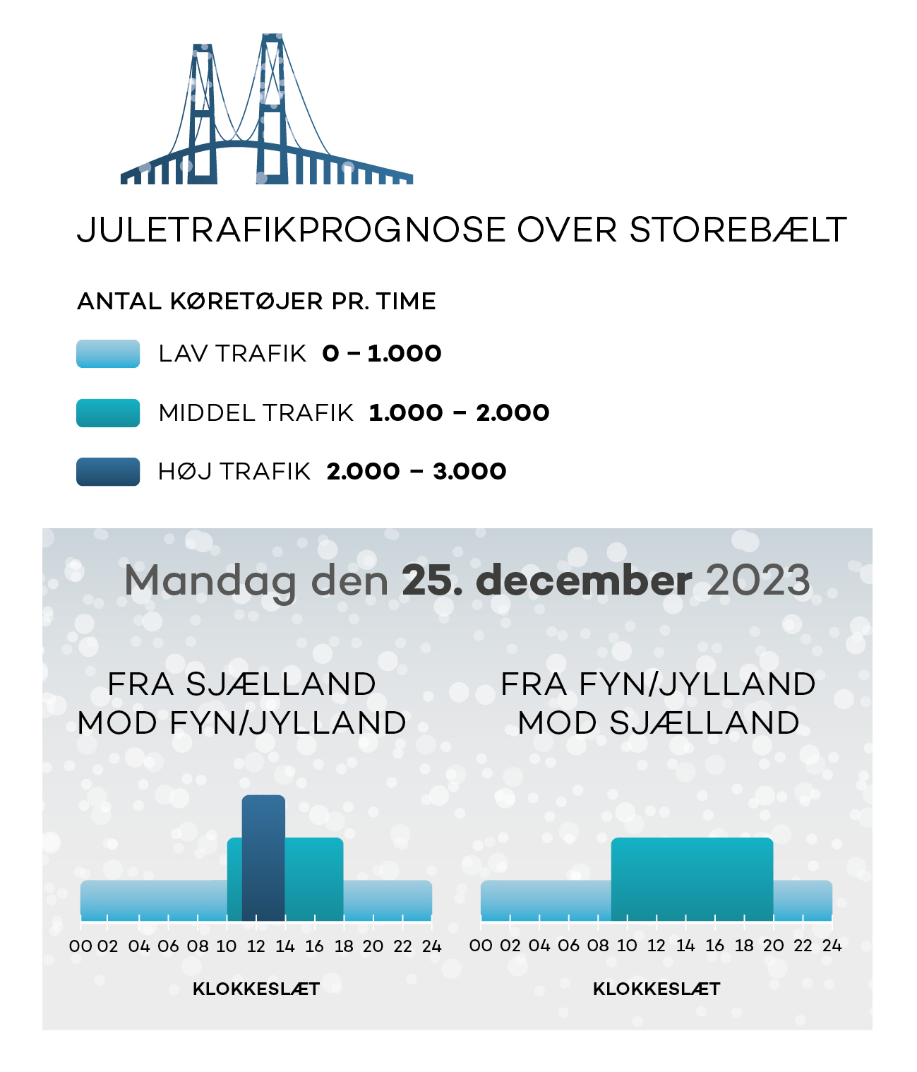 I gennemsnit kører ca. 36.000 køretøjer over Storebæltsbroen om dagen, men søndag den 22. december forventes trafikken at runde knap 40.000 biler, og den 26. december kommer mere end 46.000 biler til at krydse bæltet.