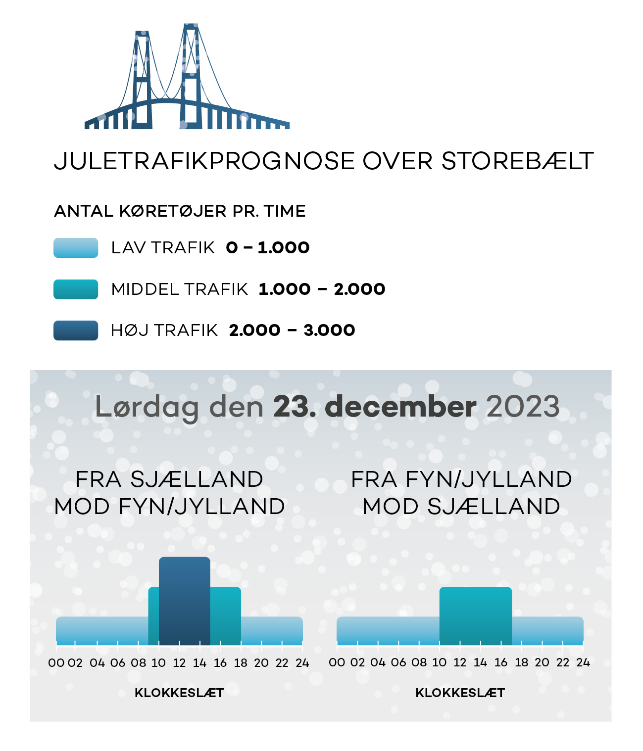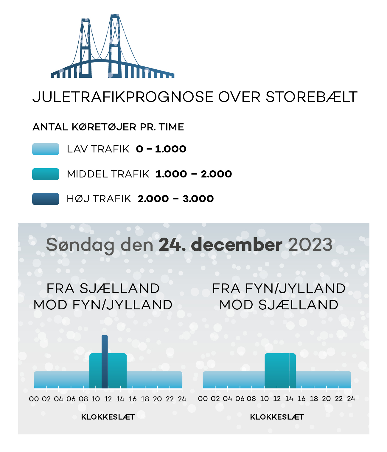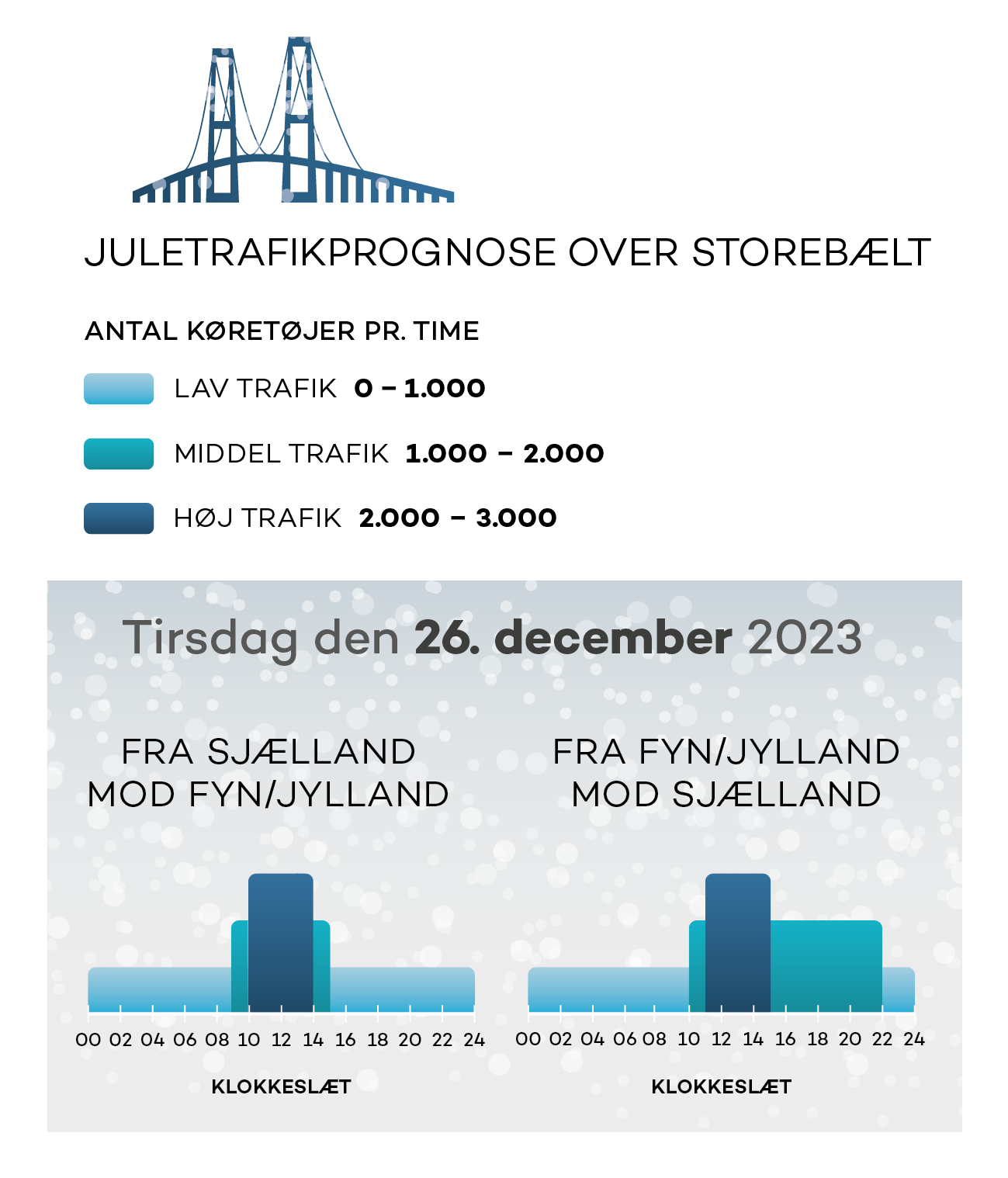 I gennemsnit kører ca. 36.000 køretøjer over Storebæltsbroen om dagen, men søndag den 22. december forventes trafikken at runde knap 40.000 biler, og den 26. december kommer mere end 46.000 biler til at krydse bæltet.