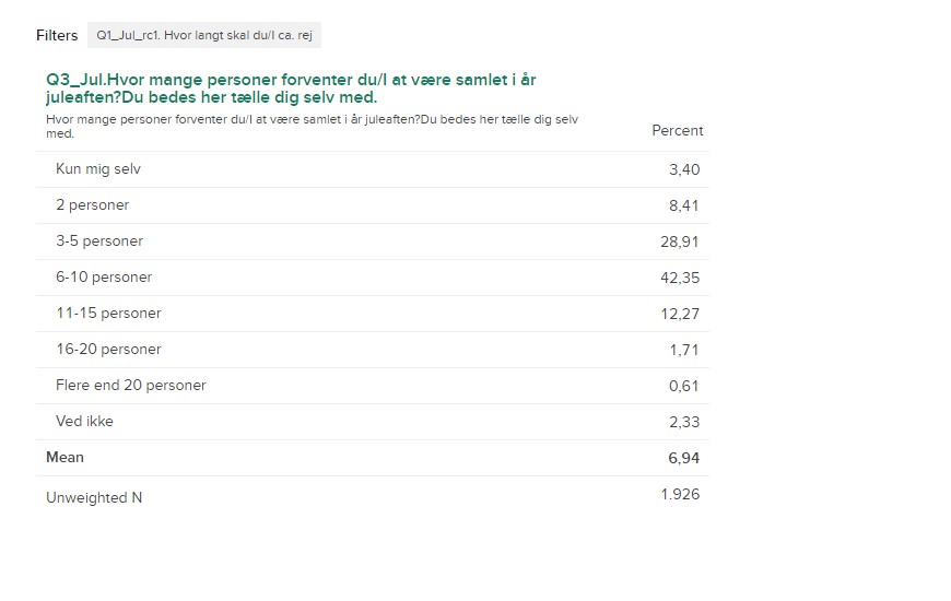 Det er i Vestjylland, man er flest samlet til jul – 7,4 personer tæt forfulgt af Nordsjælland og Nordjylland, hvor man i snit også er over syv personer sammen juleaften. (se vedhæftede tabel)