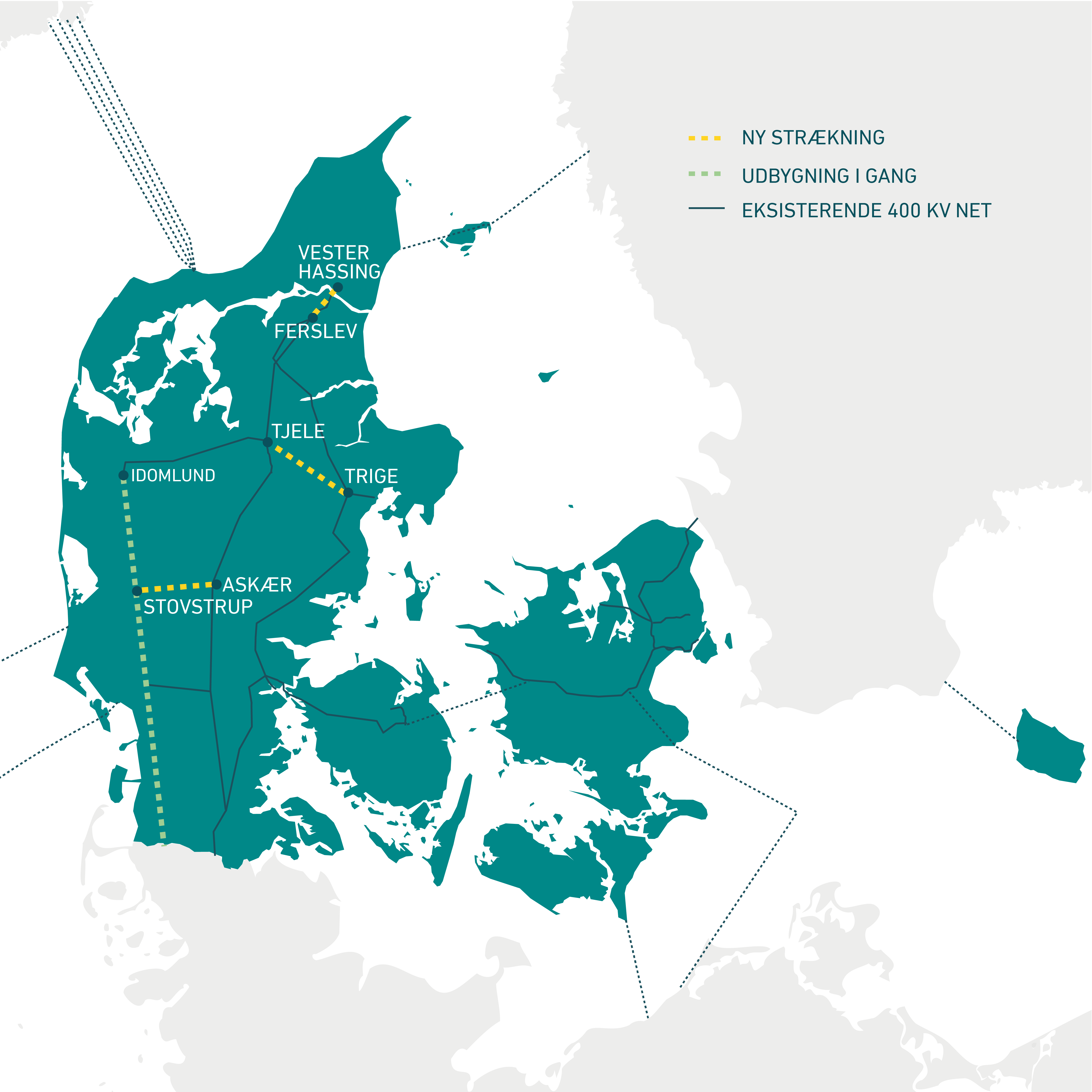 Udbygningen af højspændingsforbindelsen er samtidig startskuddet til, at hele det danske 400 kV-system udbygges og forstærkes.