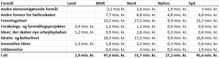 Oversigten herunder viser, hvor mange penge der er gået til forskellige typer af formål. Samme oversigt fordelt på de regionale vækstpuljer er vedhæftet.