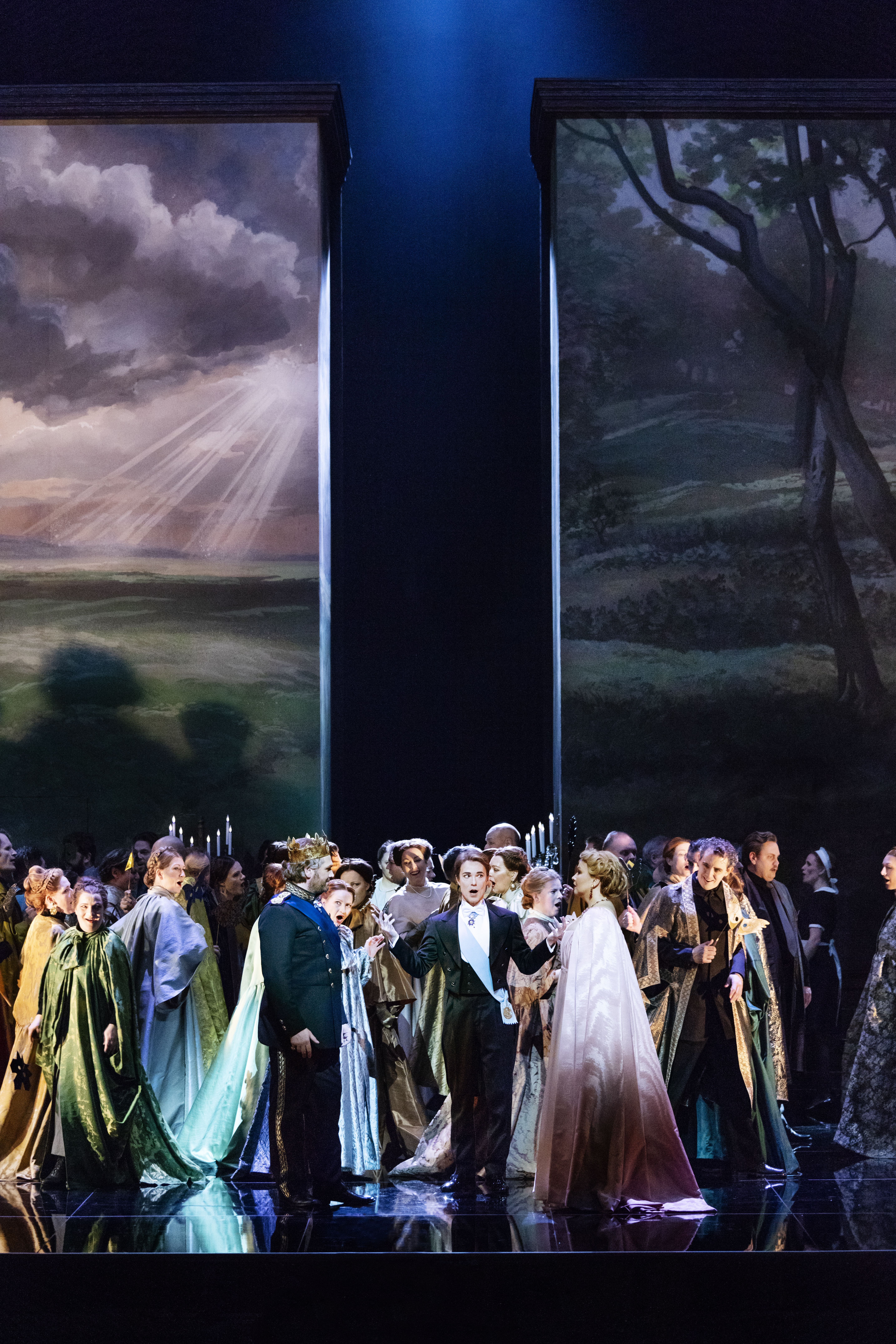 Philipp Fürhofers imponerende scenografi spejler kontrasten mellem de to forskellige verdener: Kongens verden er en smuk og eskapistisk overklasseverden med skønne malerier. Men når kulissen drejer, viser det sig, at kongens verden er en illusion, som han holdes indespærret i. Kæmpespejle på begge sider af scenen reflekterer og afspejler den omkringliggende verden med rå magt og kynisme.