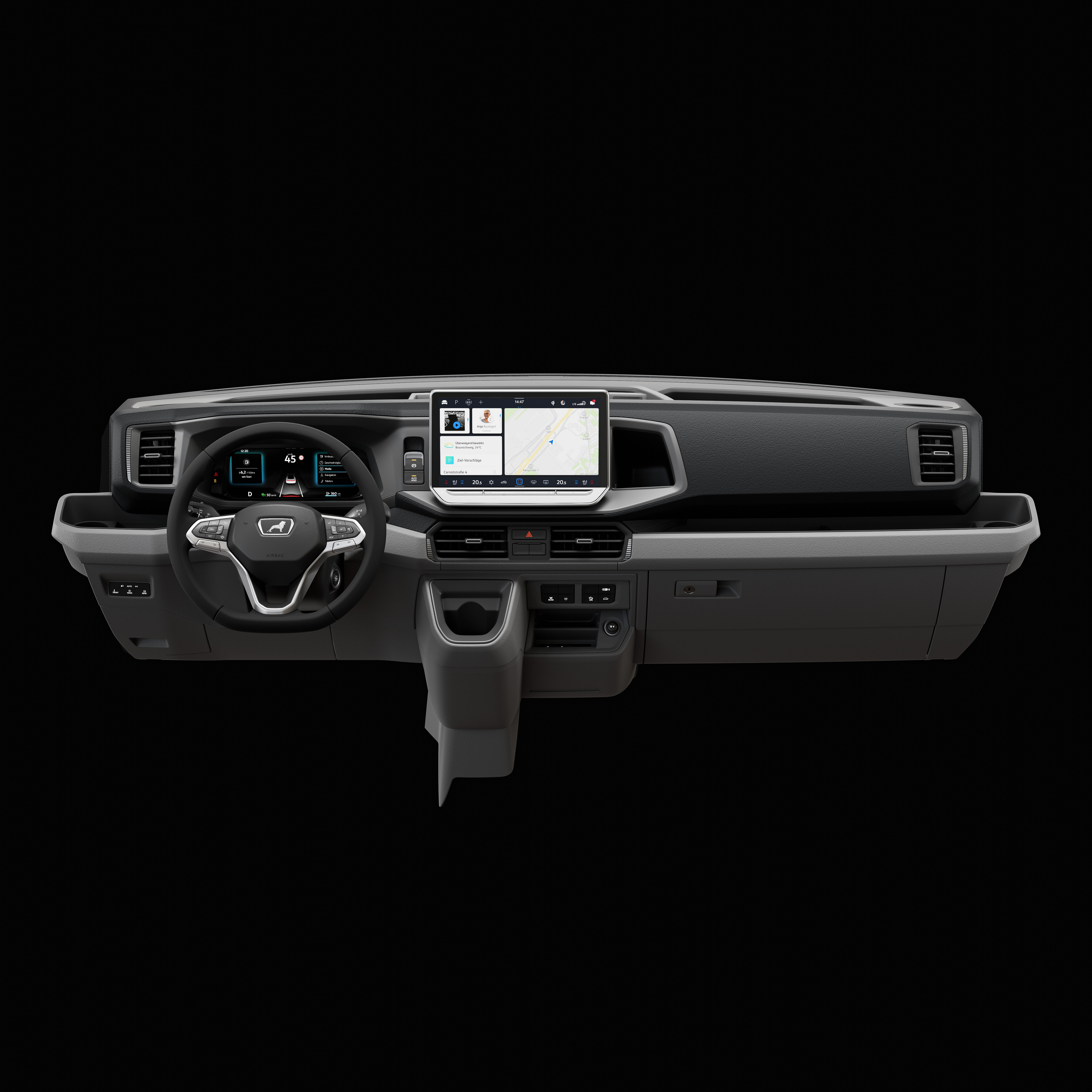 Andre høydepunkter på dashbordet inkluderer det nydesignede ergonomiske multifunksjonsrattet med integrert girspak på rattstammen (for automatgir), den elektroniske parkeringsbremsen og Keyless Go-funksjonen. Disse nye elementene har det som skal til for å gjøre hverdagen mer effektiv og mer komfortabel for TGE-sjåføren. Koppholderne, oppbevaringsrommene og mobiltelefonrommet med induktiv ladefunksjon bidrar også til dette.