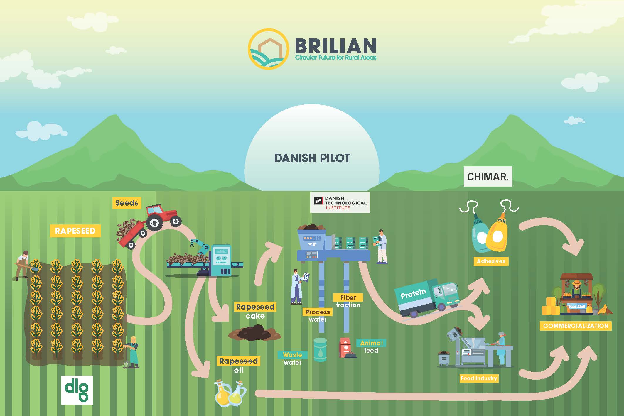 Danske landmænd producerer 400.000 tons raps årligt, som bliver presset, så der udvindes rapsolie. I dag benyttes restproduktet, pressekagen, til dyrefoder. I BRILIAN skal man benytte en proces, udviklet af Teknologisk Institut, til at udvinde et proteinprodukt, som kan videreforarbejdes til vegansk protein til fødevarer og proteinbinder i lim og dermed få et højere liv i bioøkonomien.