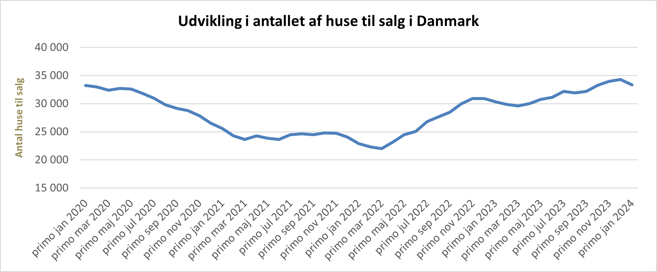Det fremgår af Boligsidens nye udbudstal, som eksempelvis viser, at der ved indgangen til januar 2024 var 33.339 villaer og rækkehuse til salg på landsplan.