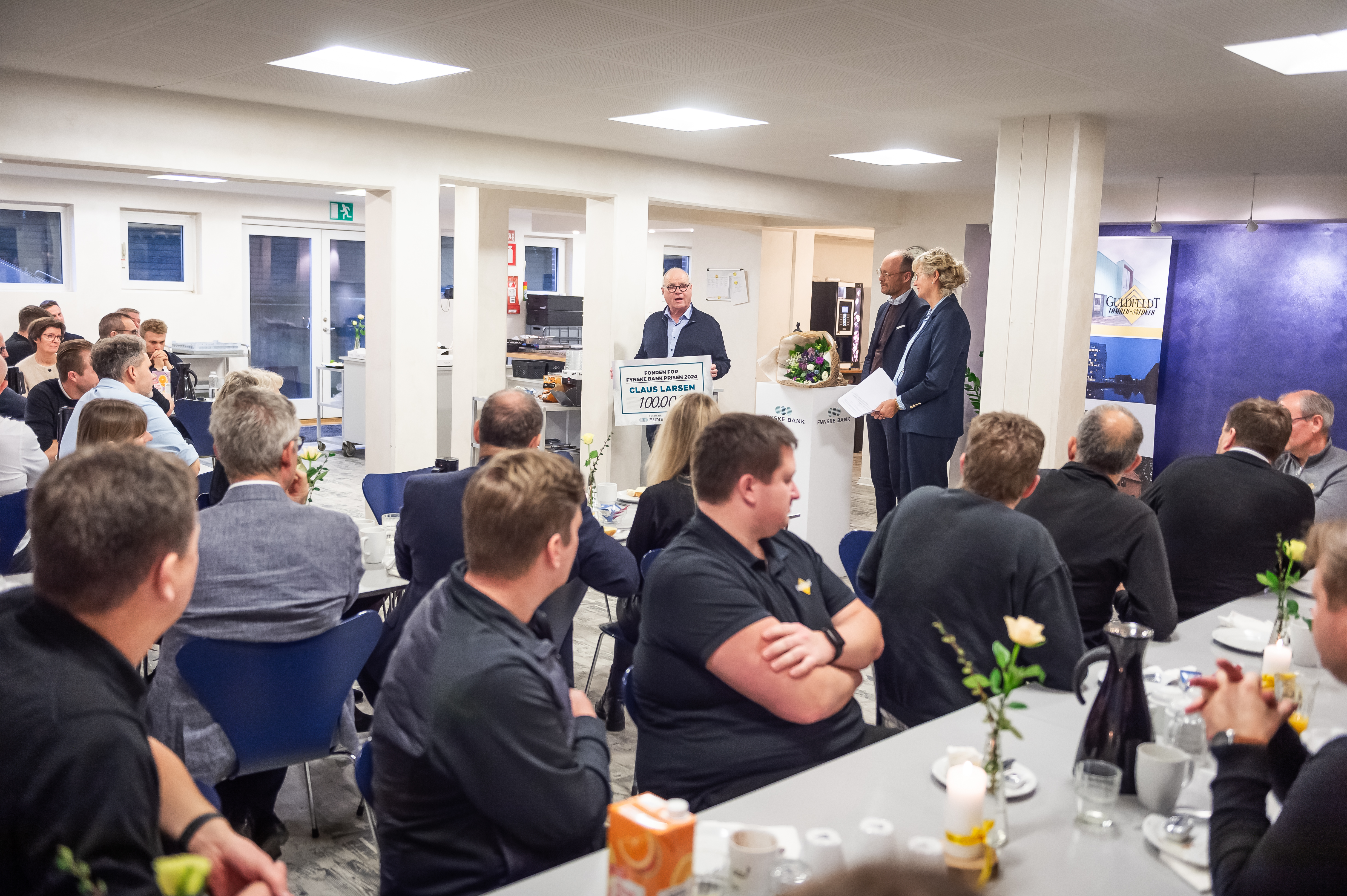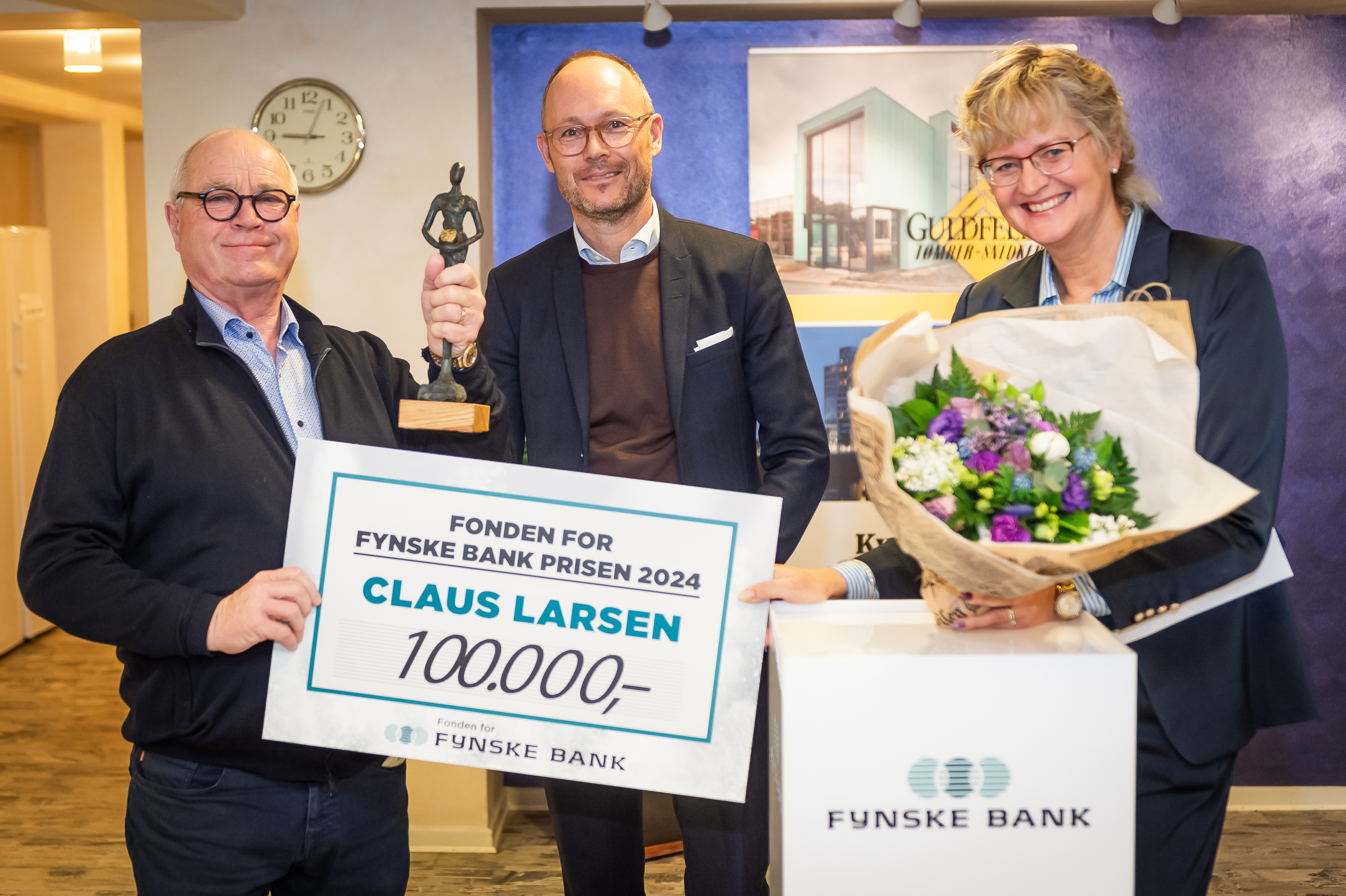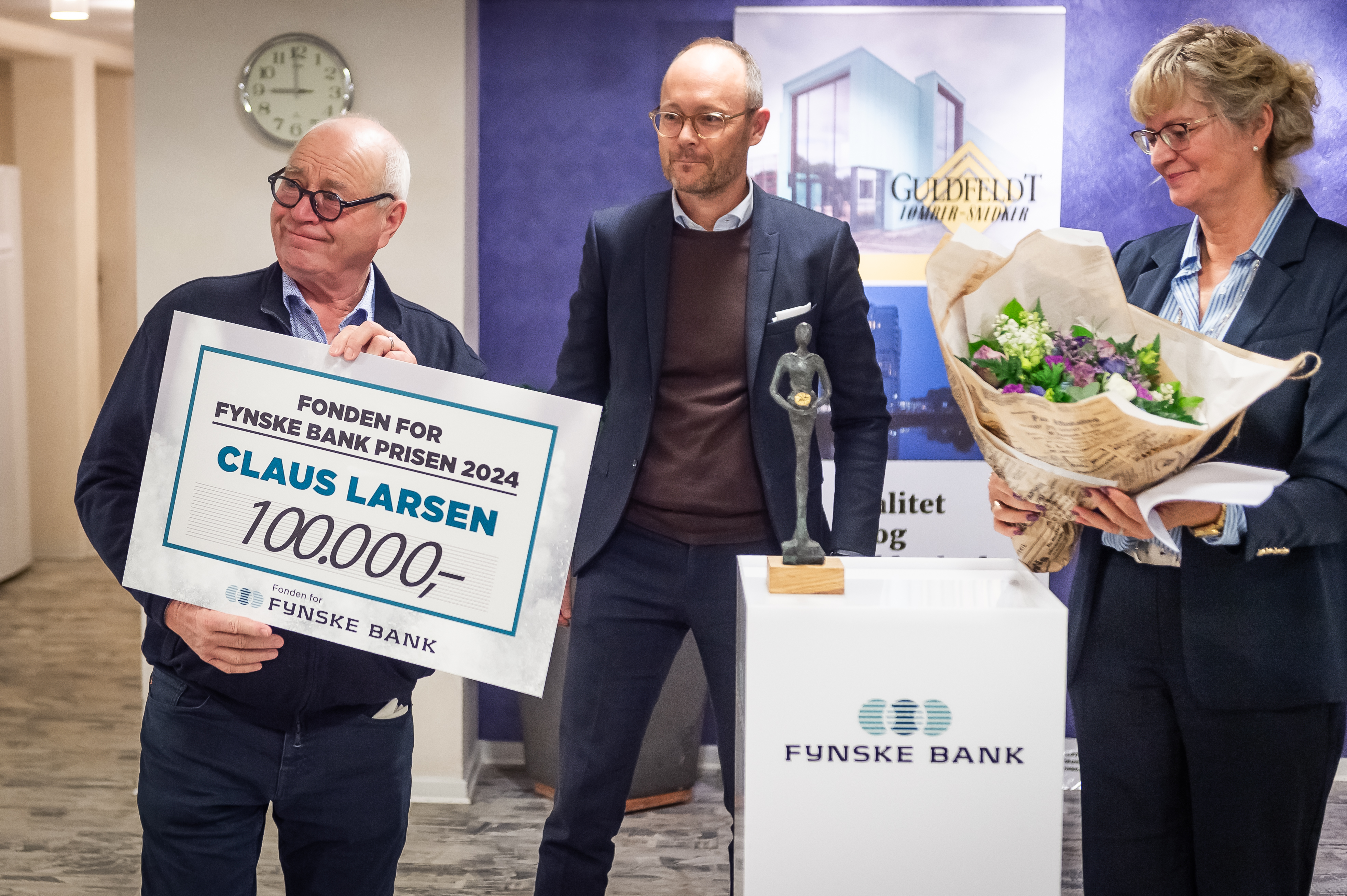 - Claus Larsen har betydet meget for Svendborg og egnen på Sydfyn. Navnet Guldfeldt er velkendt fra mange byggepladser i området, og på resten af Fyn. Han har været med til at udvikle bybilledet og ikke mindst lokalmiljøet, hvor Claus bl.a. støtter op om sport og foreningslivet på Fyn. Sammen med sit mangeårige fokus på trivslen blandt de ansatte, så er Claus den rigtige til at modtage Fonden for Fynske Bank Prisen, siger Kirsten Elkjær, regionsdirektør for Fynske Bank i Svendborg.