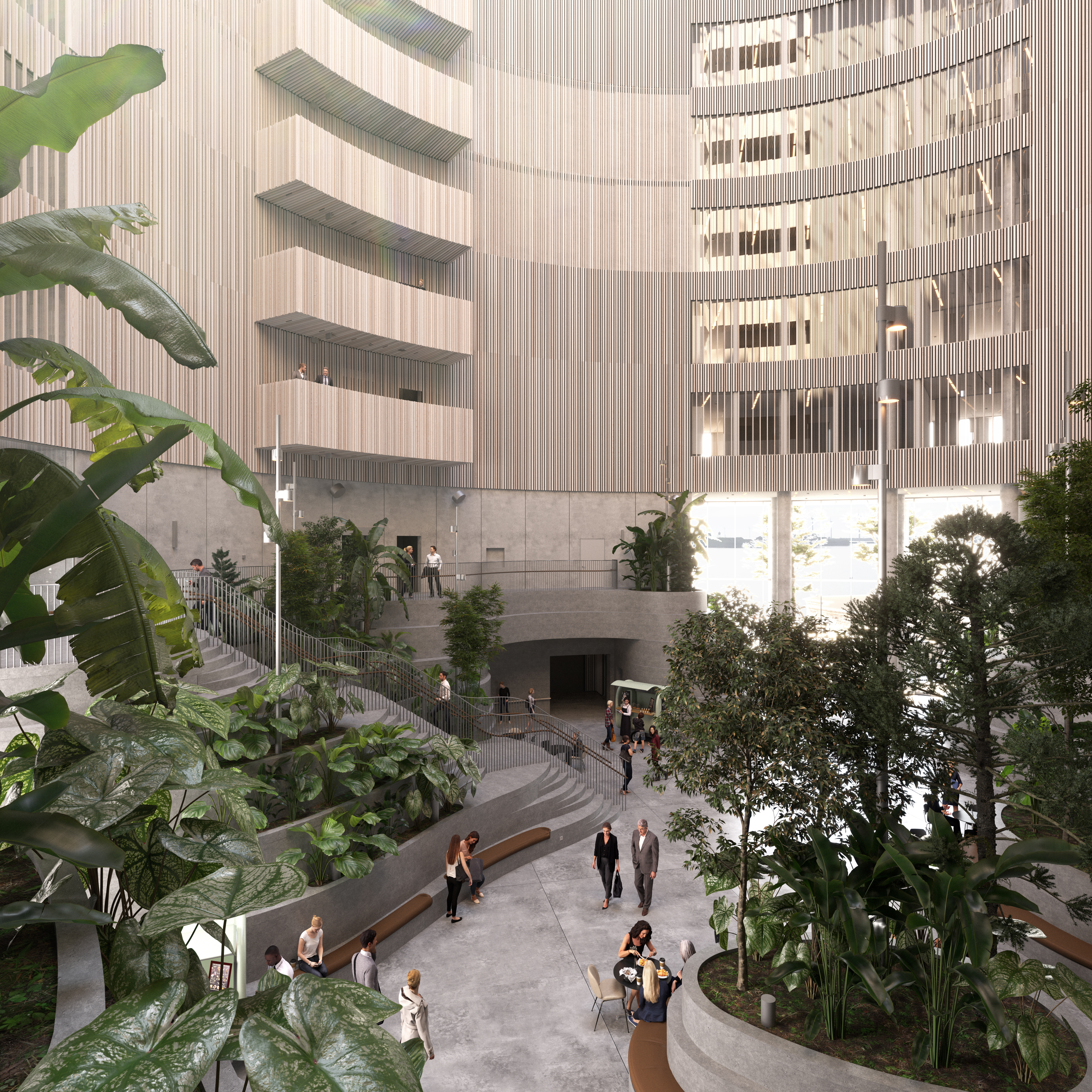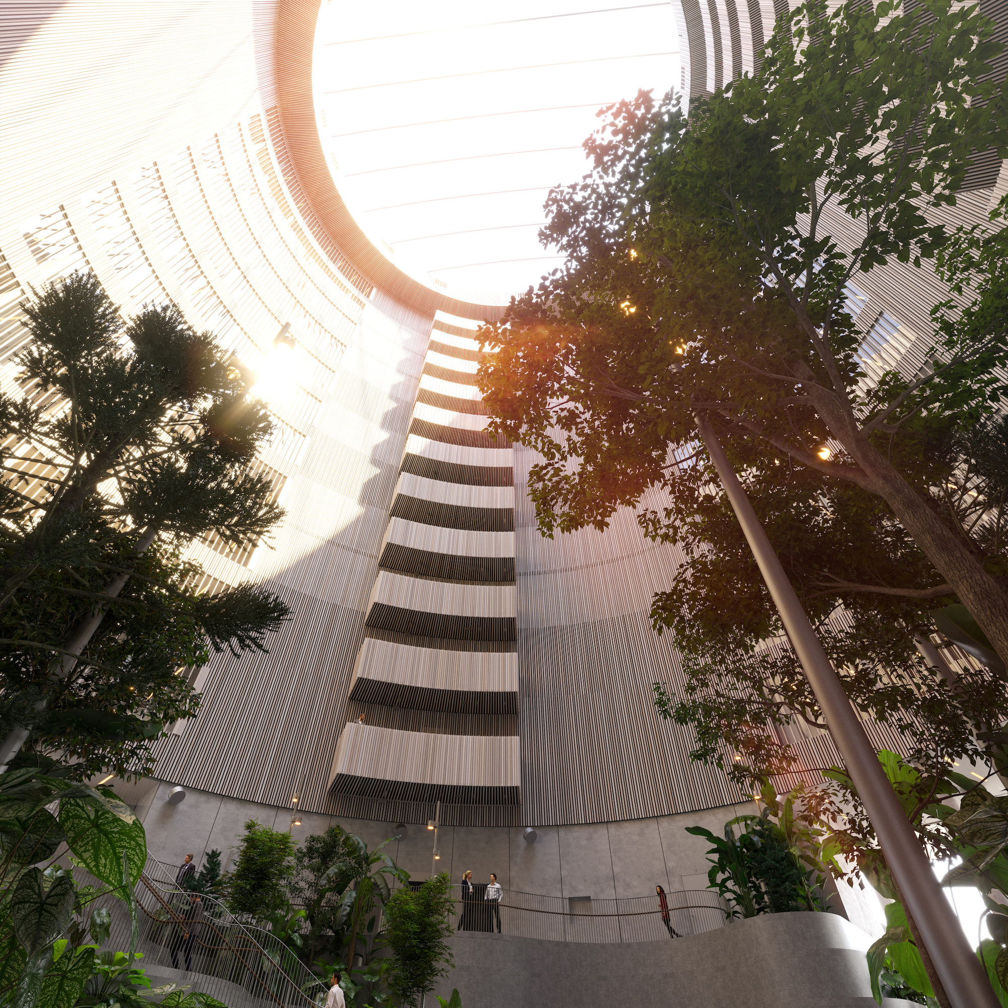 - I hjertet af Spidsen findes ‘Vinterhaven’. Et cylinderformet atrium i 14 etagers højde, der med hele 35 meter i diameter kan rumme Rundetårn og er åben for både interne og eksterne møder.