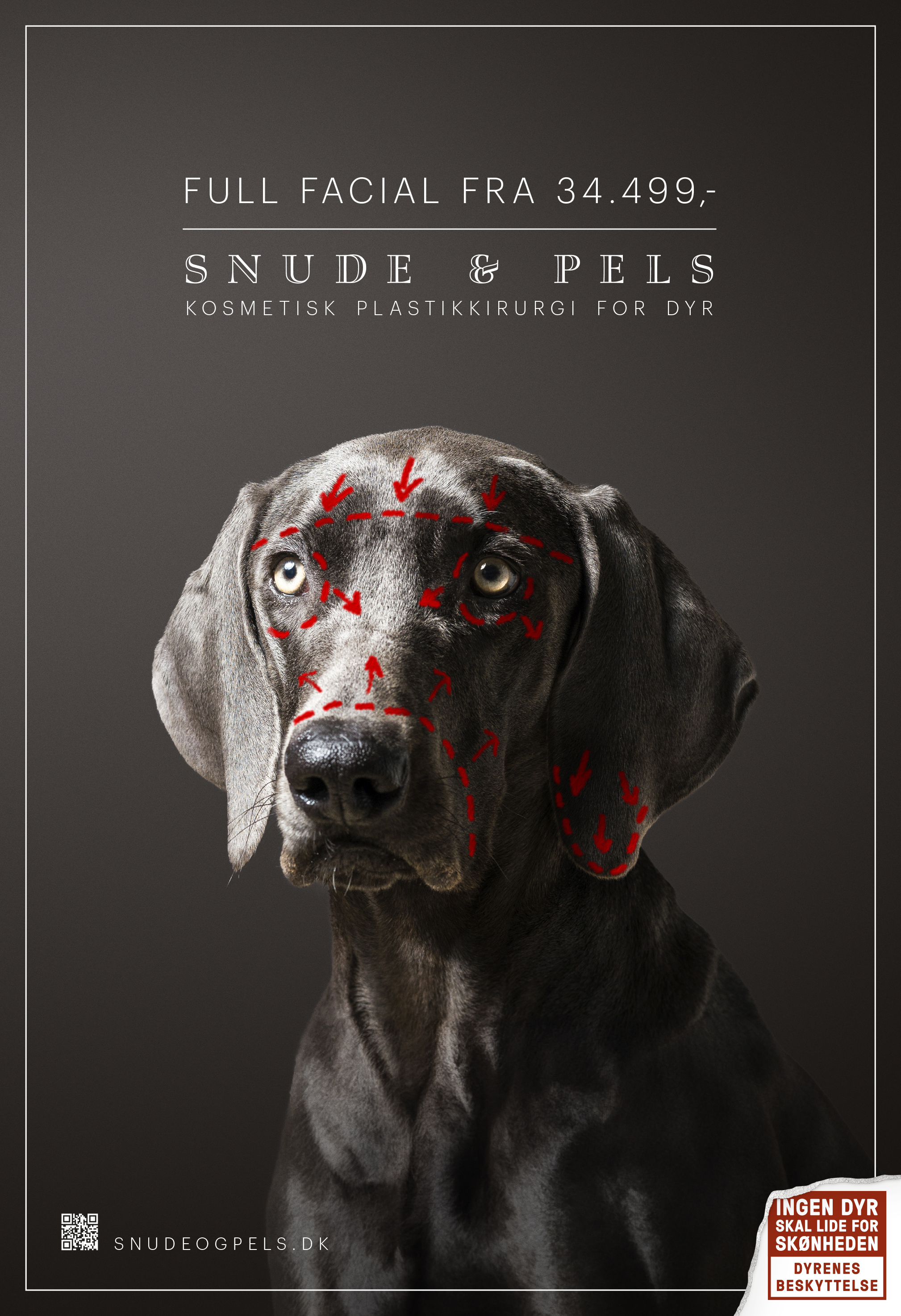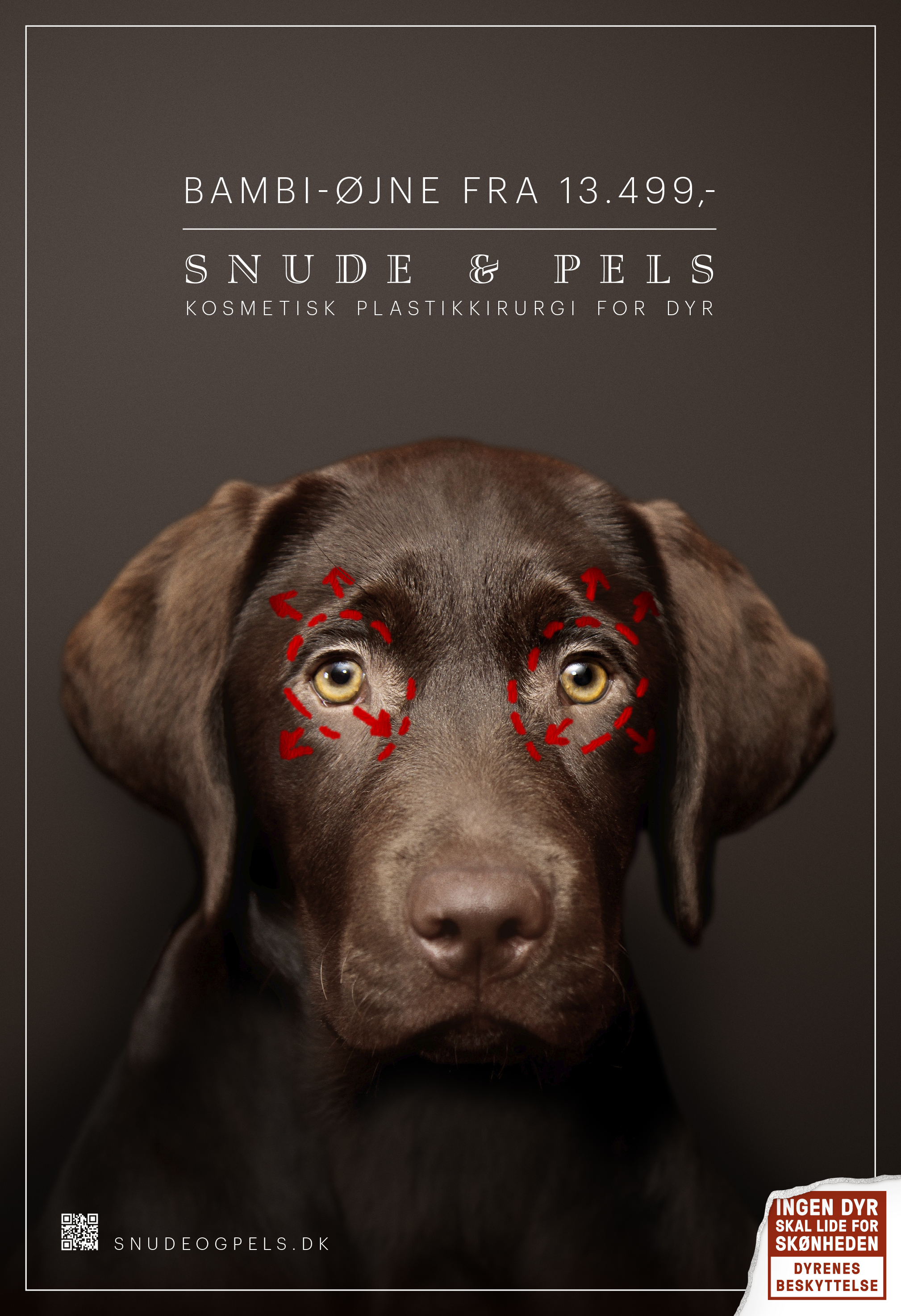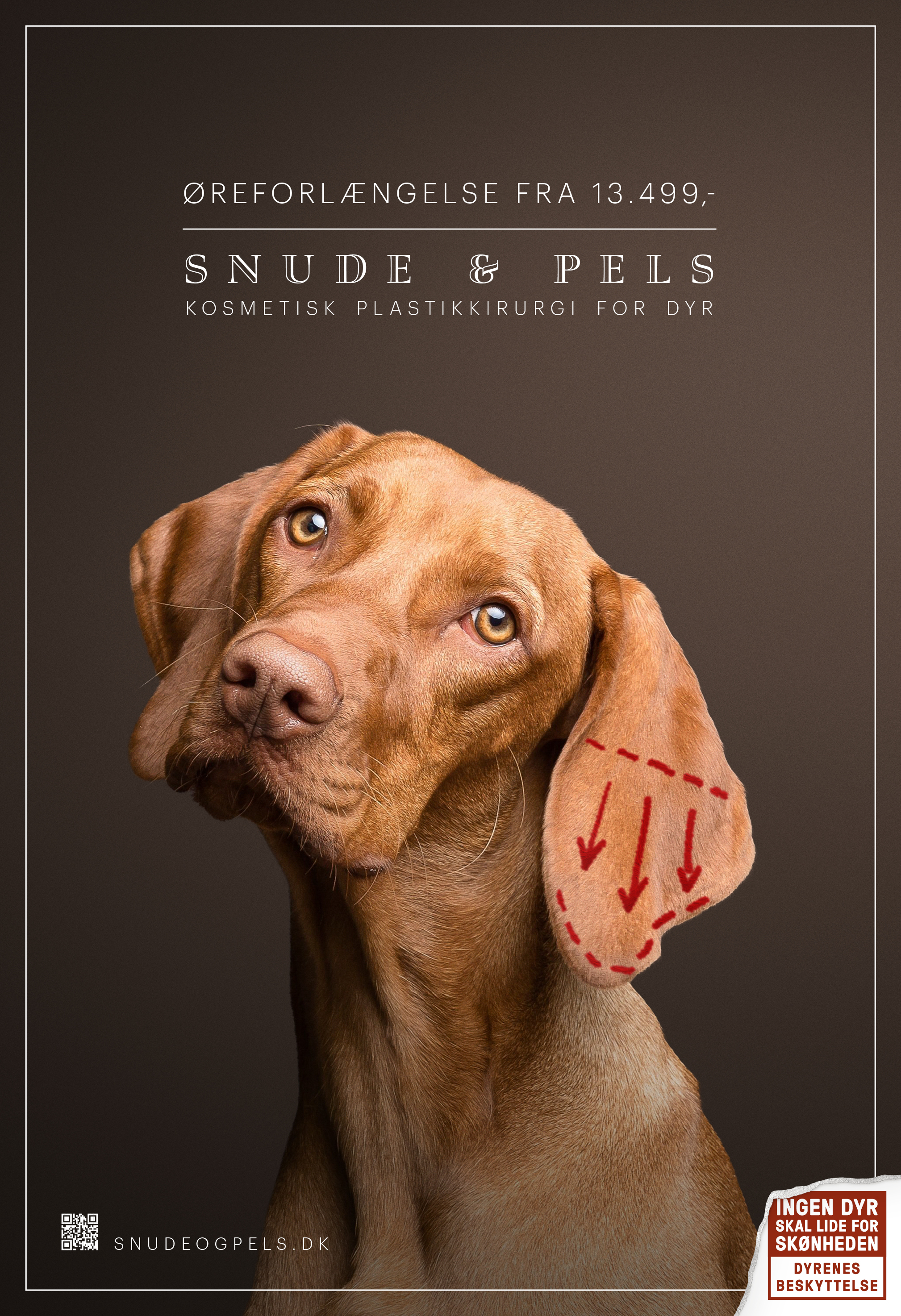 Bambi-øjne til 13.499 kroner. Snudereduktion til 17.499 kroner. Der er gode tilbud på indgreb på hunde i reklamerne fra den plastikkirurgiske dyreklinik "Snude & Pels". Annoncerne på alt fra busser til sociale medier kan forarge ved første øjekast, men der er lutter gode intentioner bag kampagnen.