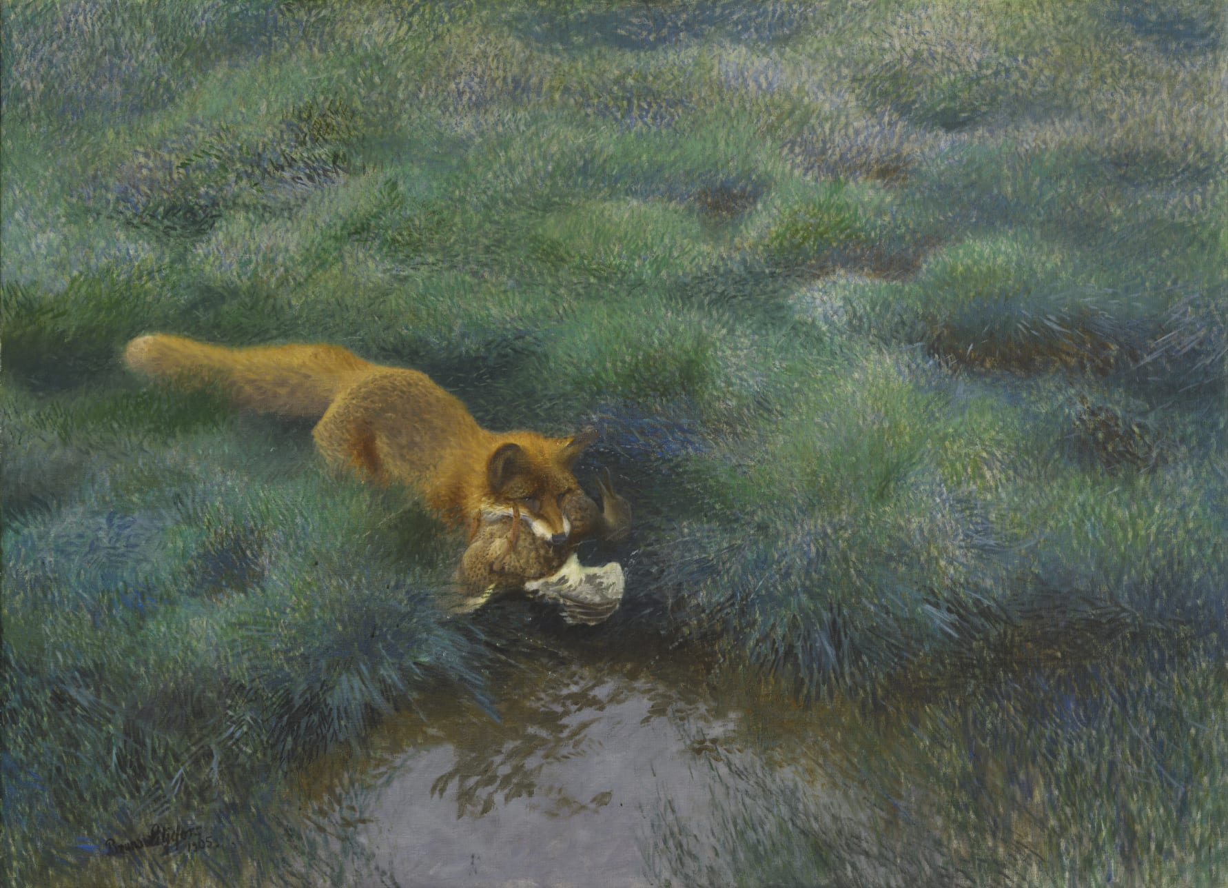 Han gik på jagt med sin bue, pil og sit gevær, siden med en kameralinse. Redskaber, der åbner sanserne og kræver, at man forsøger at gå i ét med naturen, hvis man vil fange byttet og øjeblikket. Han holdt vilde dyr i fangenskab for at studere dem - ikke blot rovfugle, men også bjørne, ræve, vildkatte og mår holdt han i sit eget menageri. Det var ræven, han var mest optaget af at observere, og den fik en helt særlig plads i hans ouevre. Talrige gange har han malet det mytiske dyr, som han havde i bur for at studere - og gøre tamt.