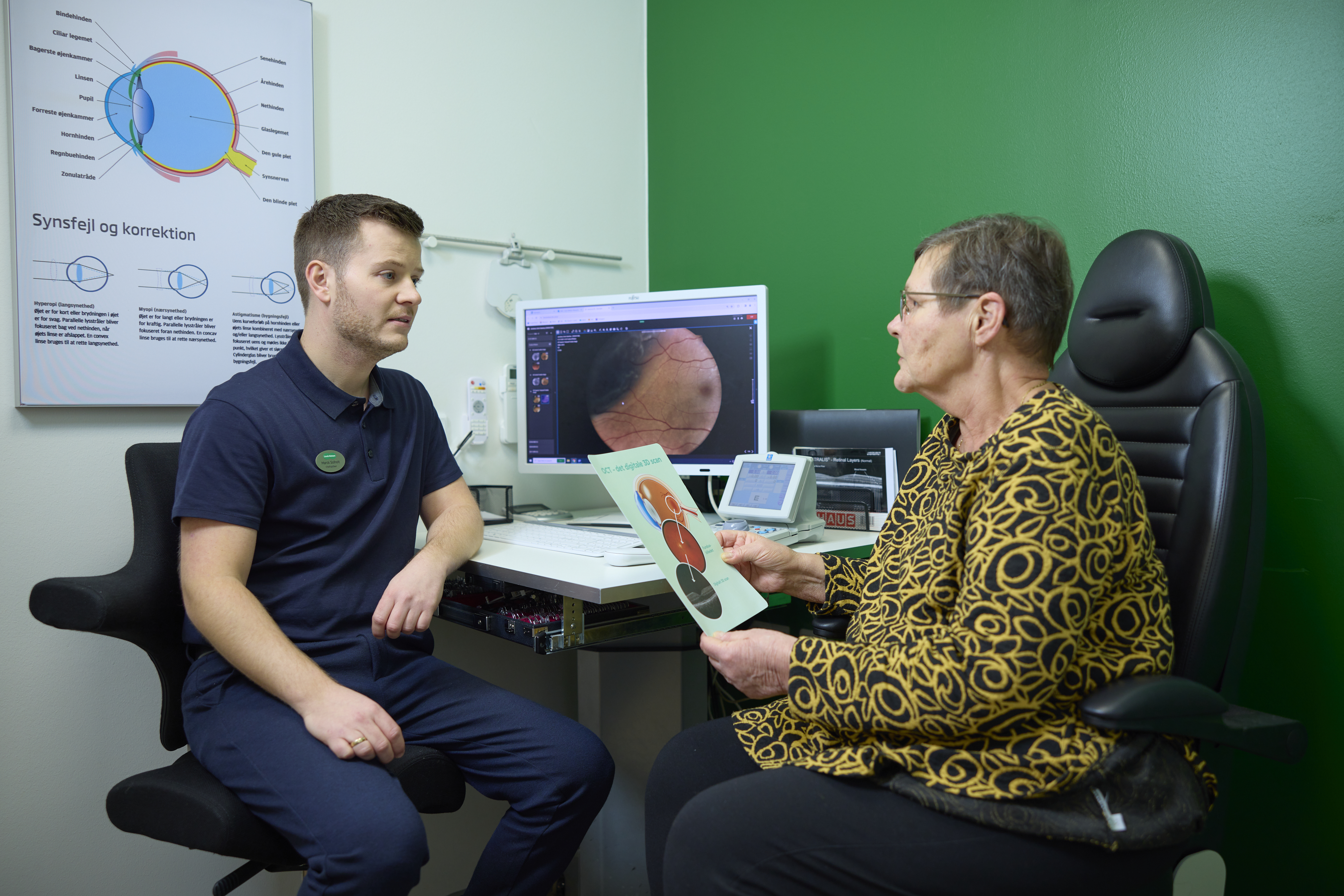 - Med de symptomer, hun beskrev, vidste jeg, at hun skulle undersøges nærmere med det sundhedstjek, som hører til en synstest. Her tager vi blandt andet et billede af øjets nethinde, siger han.