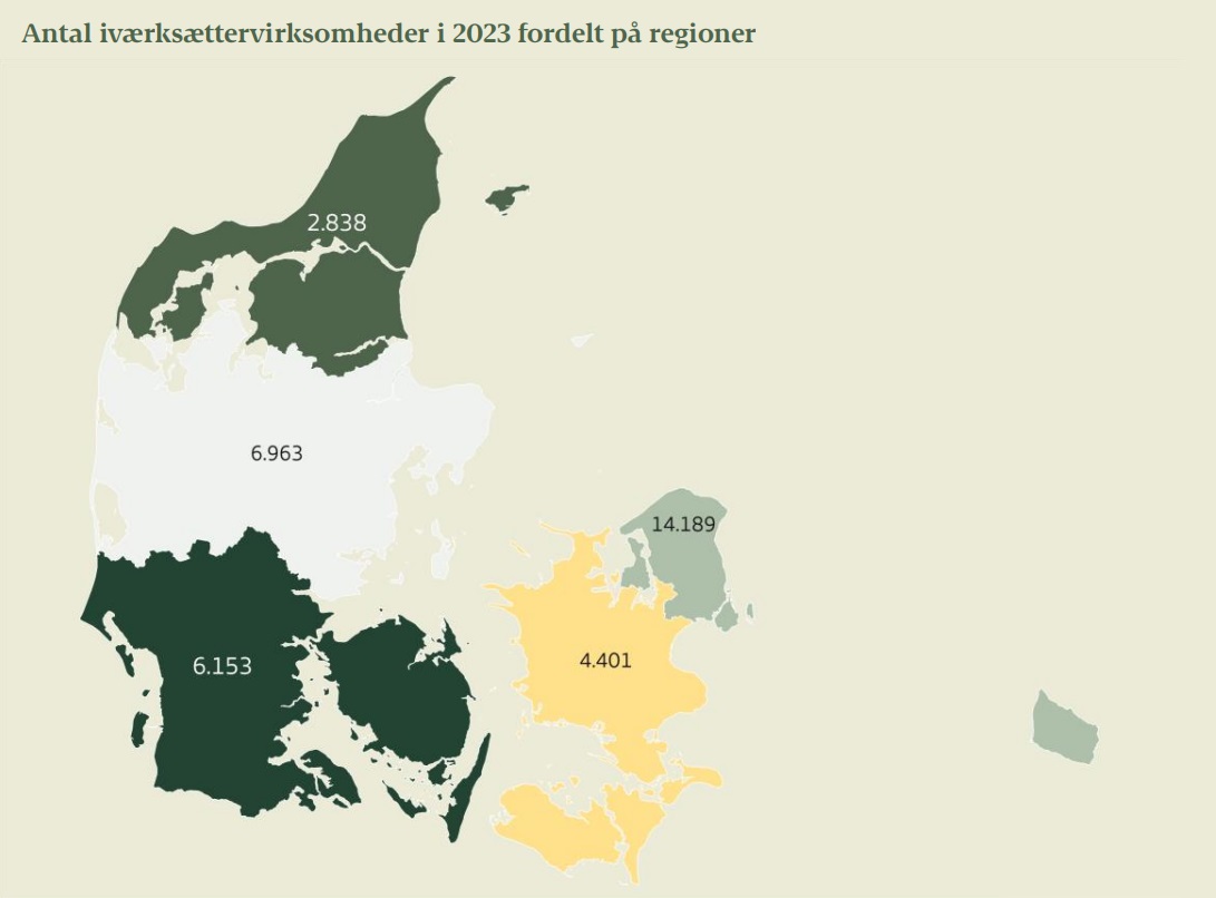 Region Hovedstaden stadig den region, der med 14.189 nye virksomheder ubetinget leverer flest nye iværksættere i landet. Derefter følger Region Midtjylland med 6963 virksomheder og Region Syddanmark med 6153. På fjerde- og femtepladsen ligger regionerne Sjælland og Nordjylland med henholdsvis 4401 og 2838 nye iværksættervirksomheder i 2023.