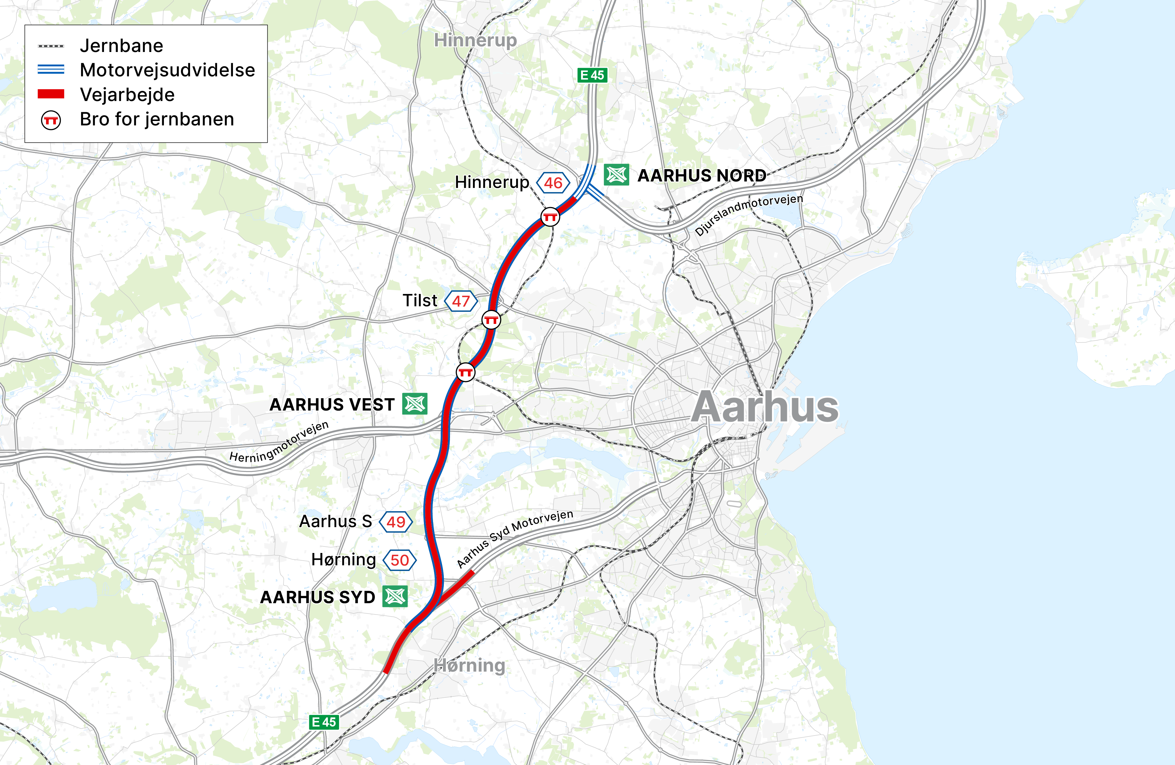 I udkanten af Aarhus krydser E45 Østjyske Motorvej over jernbanen tre steder. Broerne, der bærer motorvejen, skal nu udvides, for at give plads til et ekstra spor i hver retning. Det betyder flere kilometer med nedsat hastighed på motorvejen.