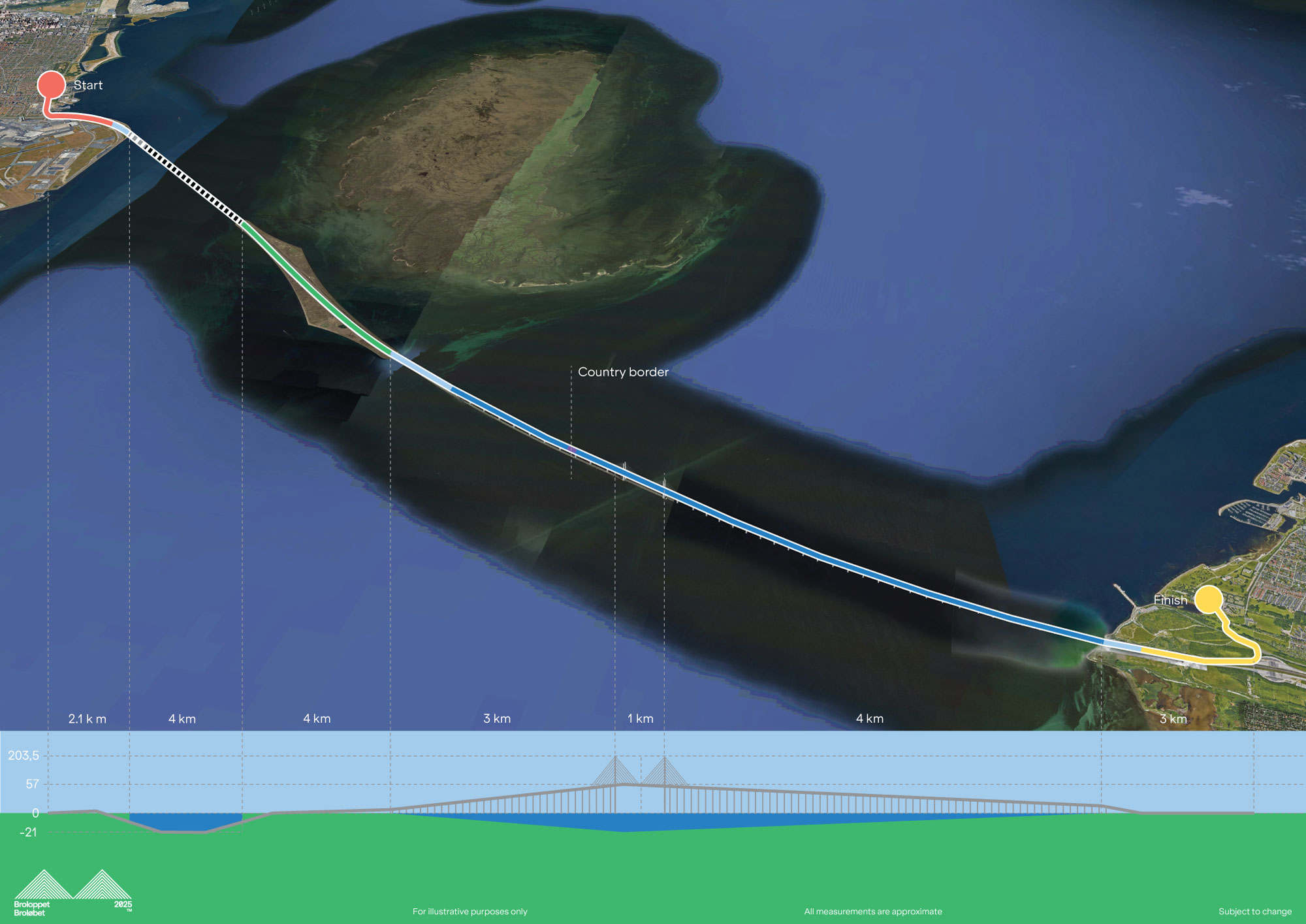 De 21,097 km for at fejre 25-året for Øresundsbroens indvielse kommer til at gå fra Øresundsparken i Kastrup til mål ved kystområdet Sibbarp uden for Malmö. Fra startområdet i Danmark løber deltagerne sig varme, inden de løber ned i 4 km oplyst tunnel til Peberholm og undervejs kommer 21 meter under havets overflade. Derefter tager ruten dem op i lyset 57 meter over Øresund med udsigt til mål i Sverige. En oplevelse bestående af skarpe kontraster, som tilfører løbefællesskabet en eksplosion af udviklinger i lys, lyd og højdefornemmelse.