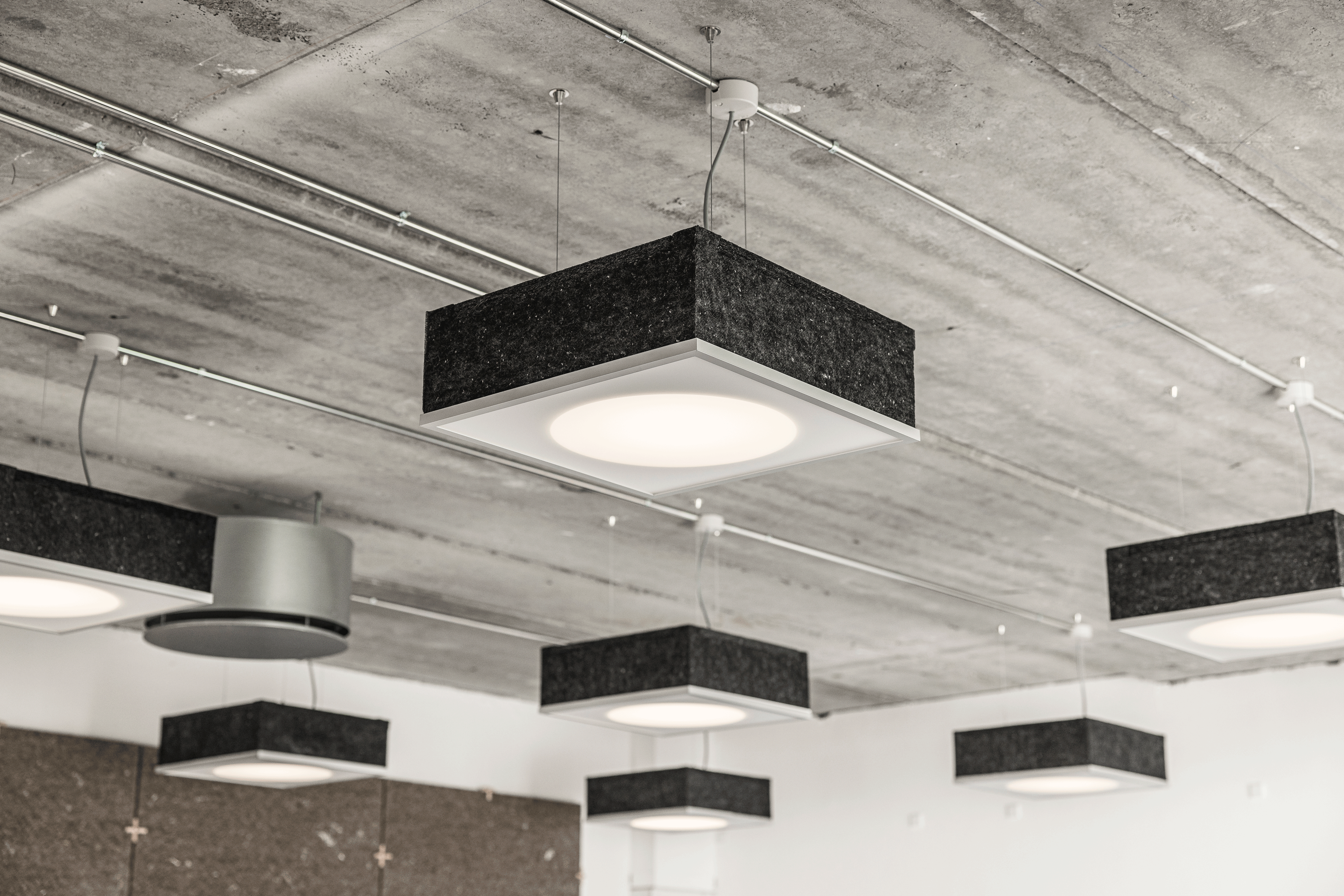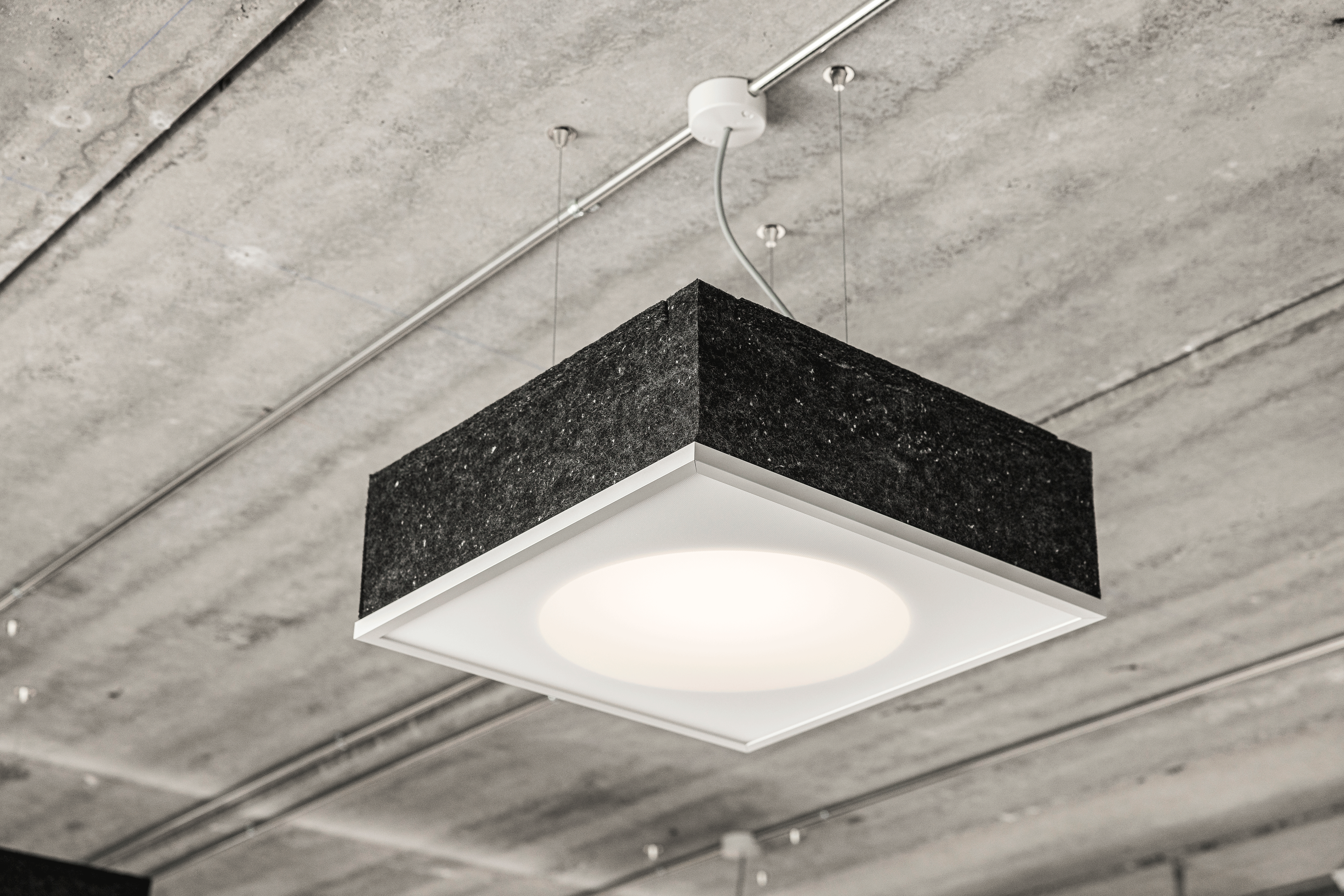 En af de store trends på kontorindretninger i dag er i stedet blotlagte rå betonlofter, og derfor er lampemodellen udviklet som en pendel, der bl.a. er beklædt med særlige akustikpaneler, der skal forbedre akustikken i de nye mere råt indrettede kontorlokaler.