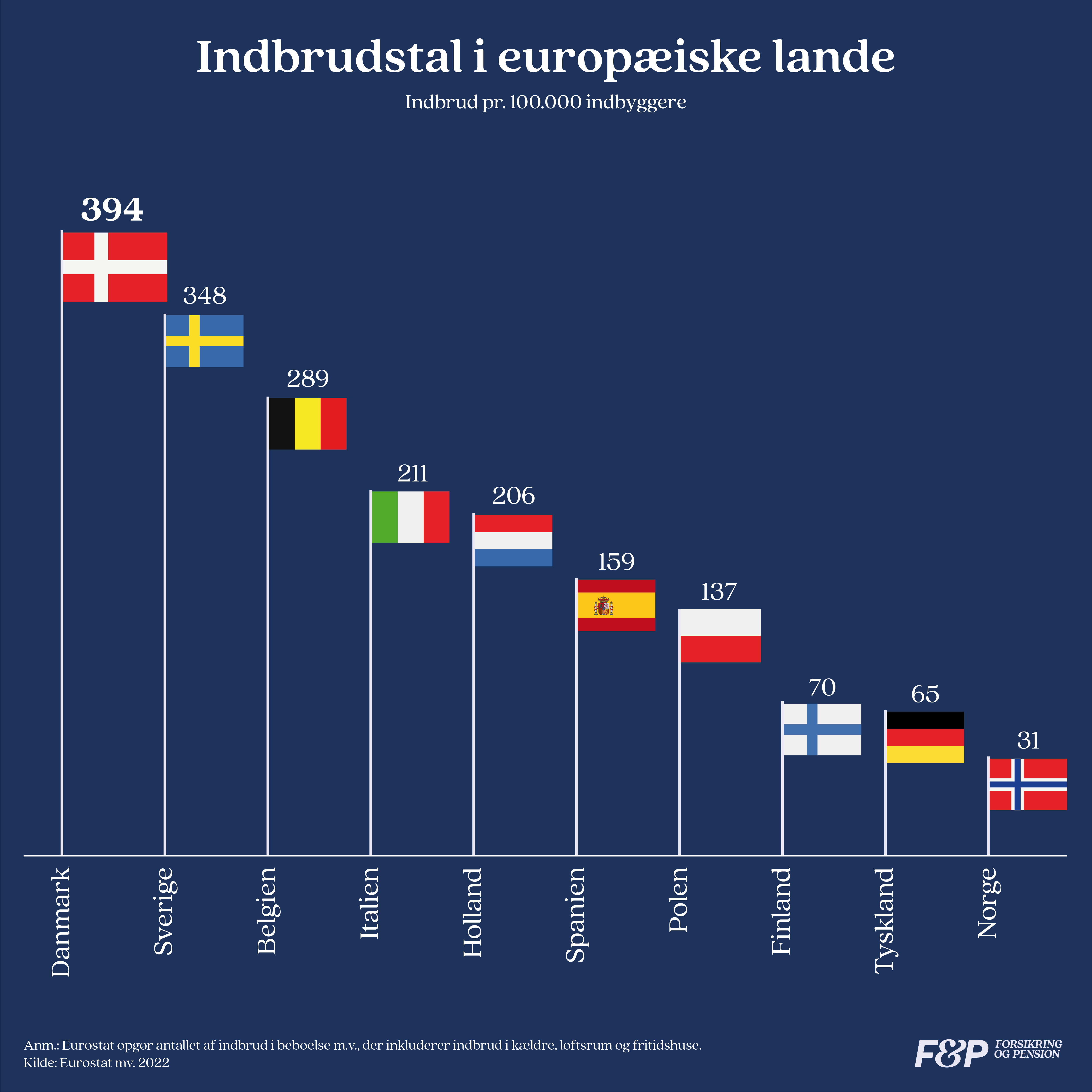 Trods en ihærdig indsats gennem de seneste ti år, der har bragt antallet af indbrud kraftigt ned, har Danmark fortsat en ærgerlig nordeuropæisk rekord, og vi er næsten dobbelt op på indbrud pr 100.000 indbyggere sammenlignet med fx Holland.