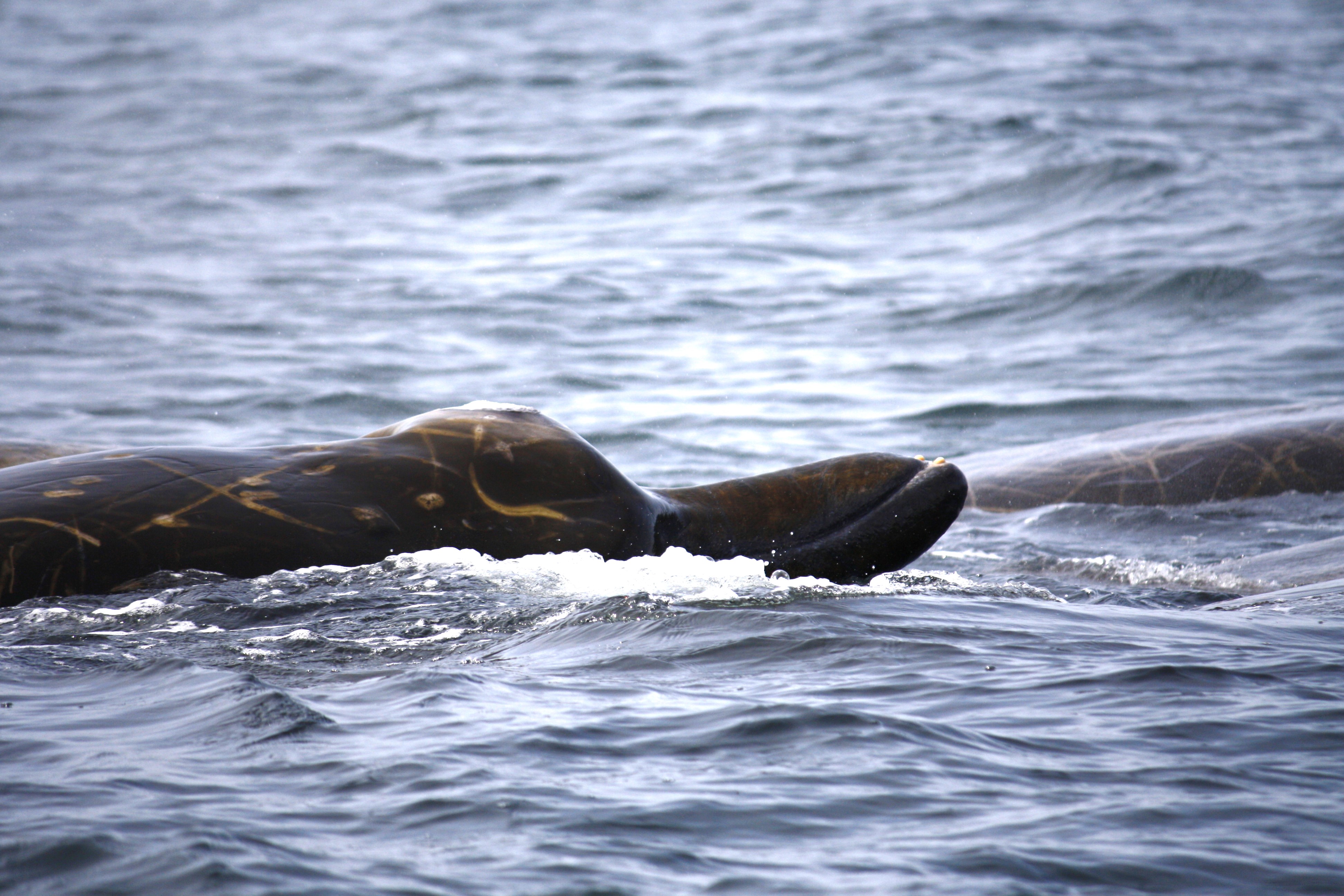 På billedet kan man se undermundens tænder. Denne hval er også fuld af ar fra kamp med andre næbhvaler.