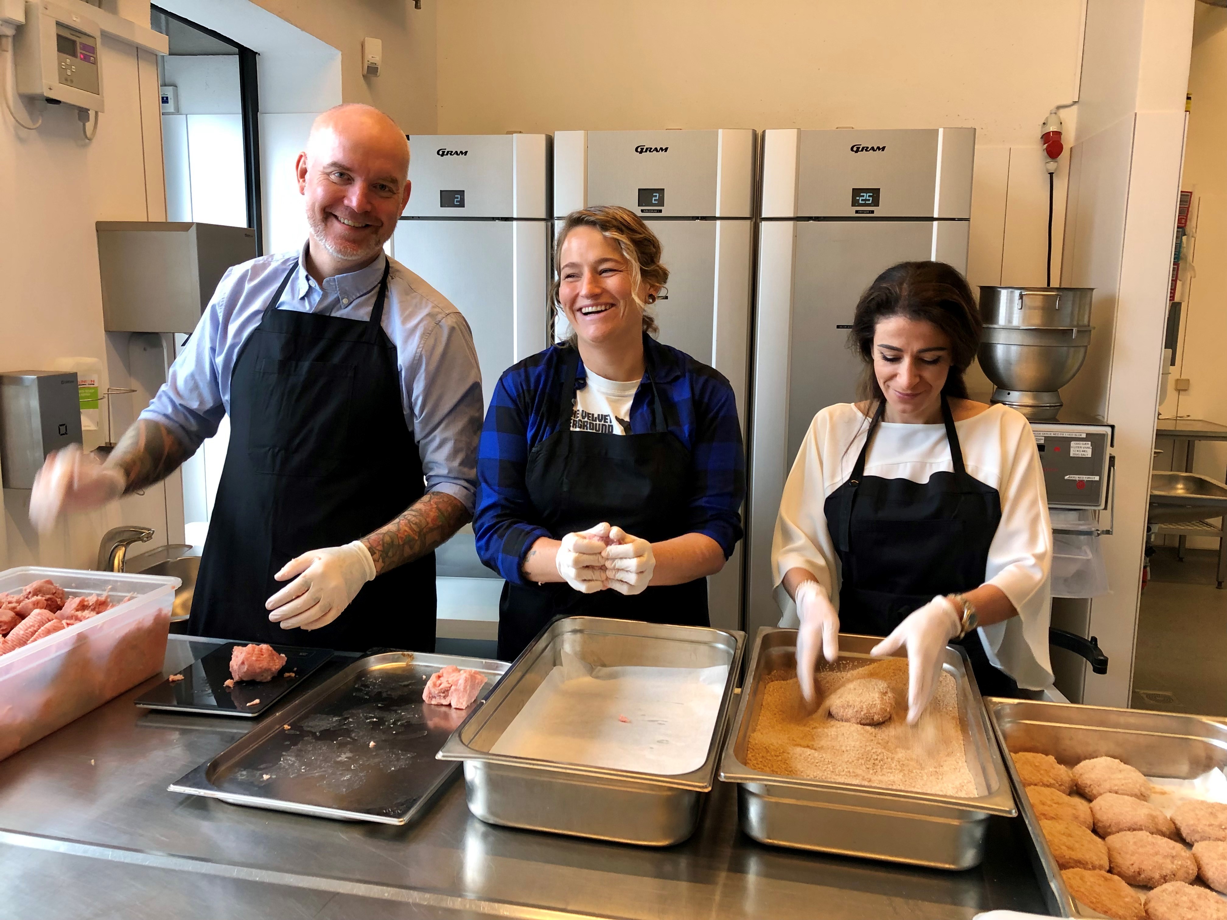 Ved en tidligere lejlighed har en delegation fra Dagrofa Foodservice hjulpet med i med i køkkenet hos JunkFood, da menuen stod på krebinetter med sovs og kartofler. Fra højre ses Karsten Bøttker (konceptchef i Dagrofa Foodservice), Marlene Lindegaard (konceptchef i Dagrofa Foodservice) og Zainab C. Ryttersgaard (CSR Projektleder i Dagrofa Foodservice).