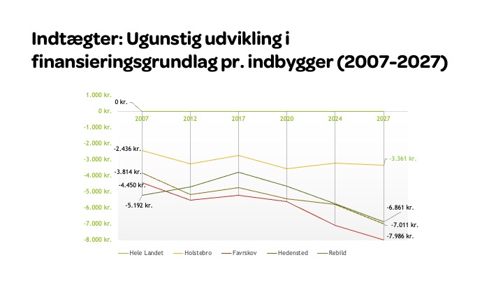 - Efter udligningsreformen i 2020 er finansieringsgrundlaget pr. borger, som består af skatter, tilskud og udligning, i nogle kommuner forværret markant (her vist med Favrskov, Hedensted, Holstebro og Rebild kommuner), så det ligger langt under landsgennemsnittet jf. illustration 1.