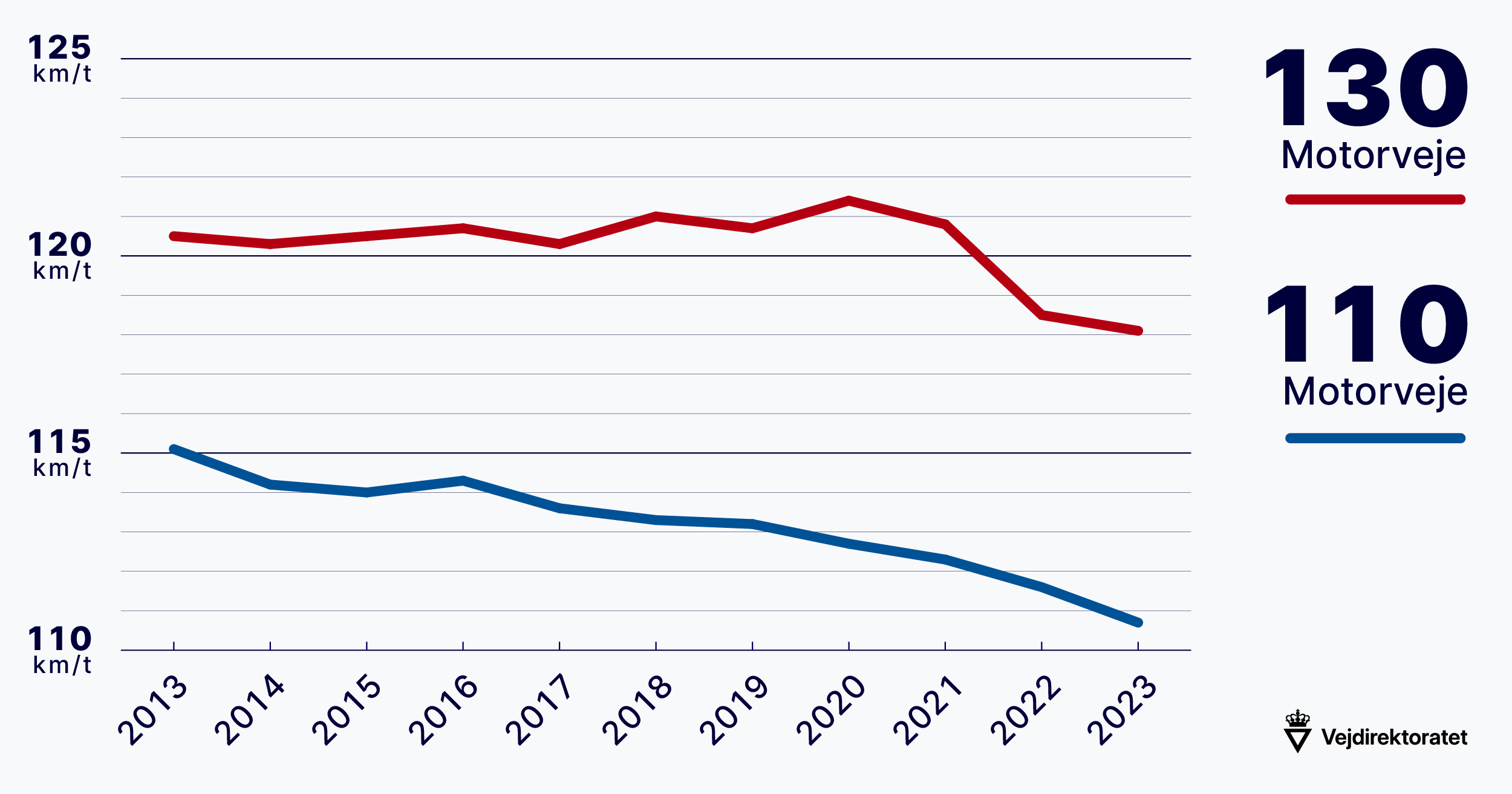 Tallene viser, at der på motorveje med en hastighedsgrænse på 130 km/t er blevet kørt med en gennemsnitlig hastighed på 118,1 km/t, mens der på motorveje med en hastighedsgrænse på 110 km/t er blevet kørt med en gennemsnitlig hastighed på 110,7 km/t.