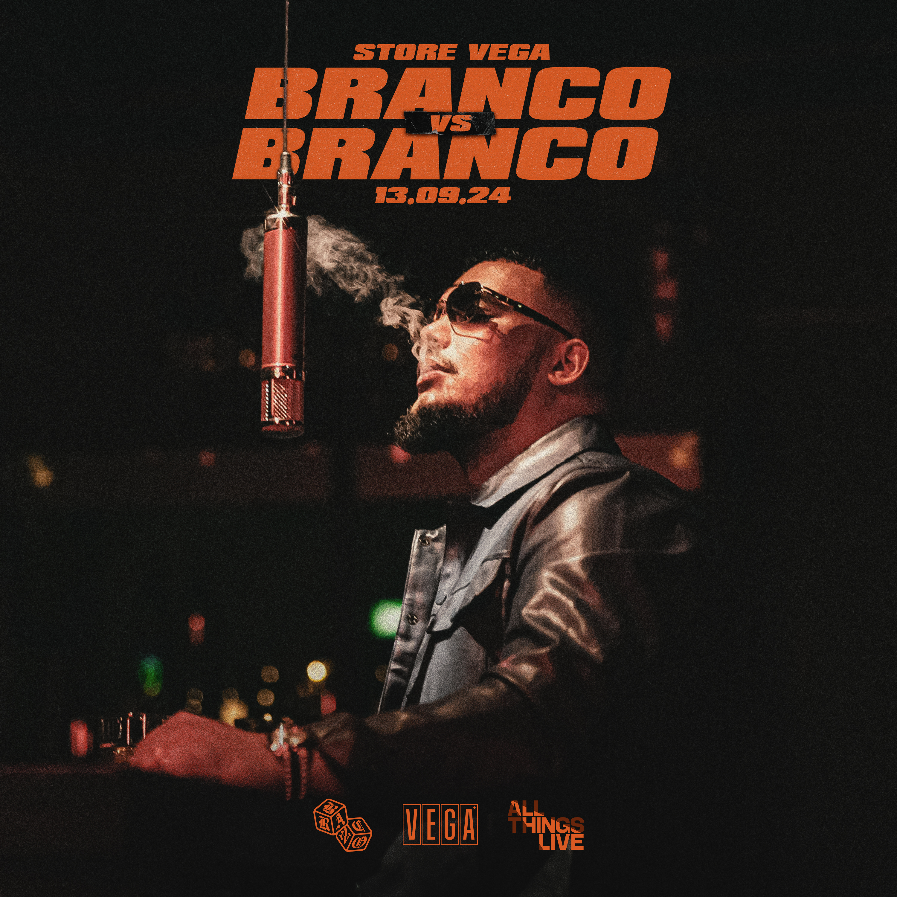 I Store Vega går Branco i ringen mod sin ligemand i hiphoppens verden - nemlig ham selv. Fortidens dæmoner bekæmpes og med ham tager han det nye kapitel i det epos, der er Brancos musikalske fortælling. Fredag d. 13 september bliver en aften du ikke vil gå glip af.