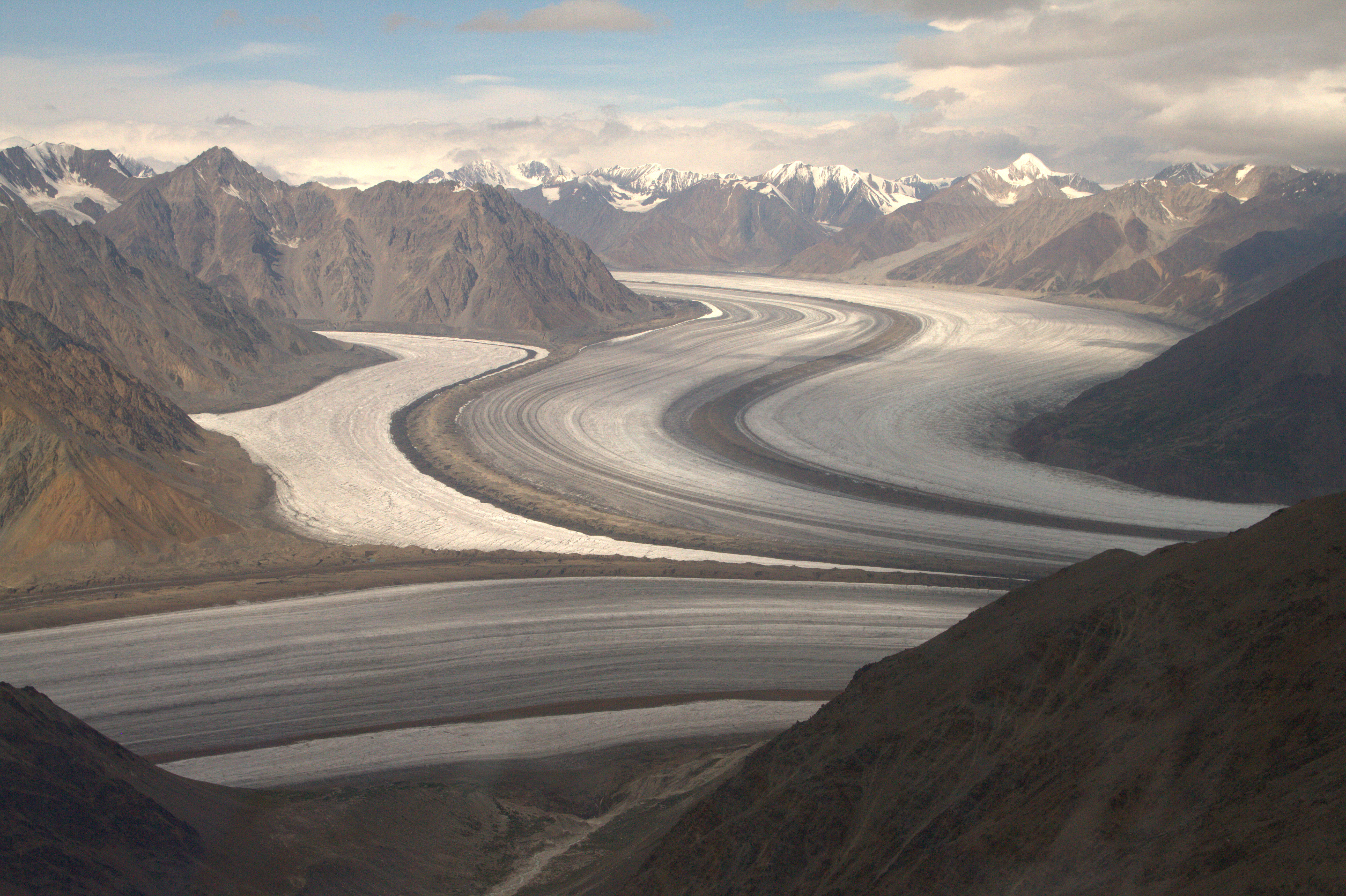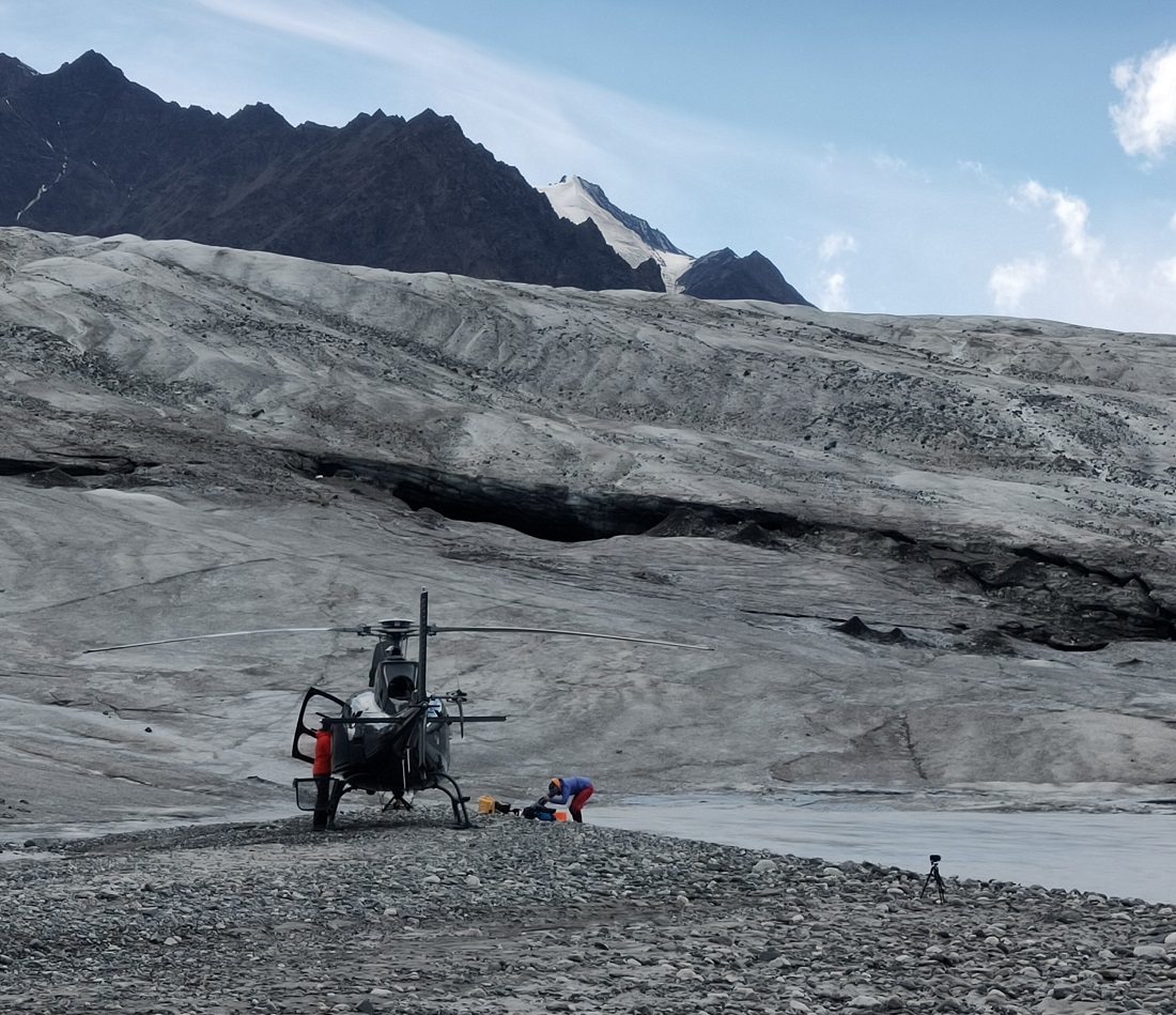 The helicopter’s rotor blades spin as its skillful pilot performs aerial acrobatics between the steep Yukon mountain sides where PhD student Sarah Elise Sapper is leading her first field expedition deep into the heart of the mountains of northwestern Canada. From the helicopter windows, her eyes fall on the jagged edge of the Donjek glacier: meltwater swirls out from beneath the ice like a whirlpool.