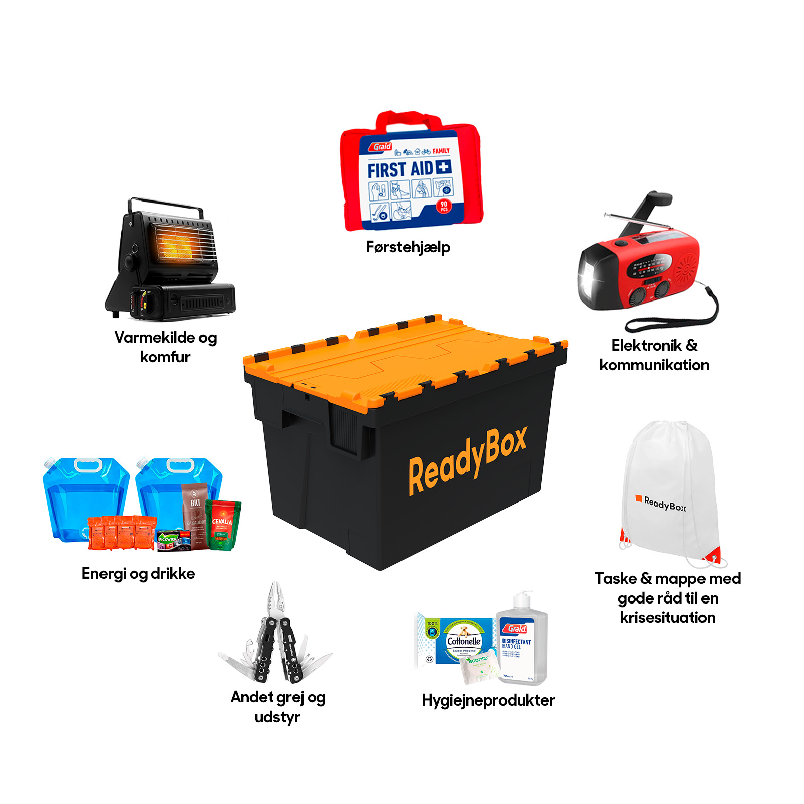 Indholdet er udvalgt på baggrund af eksperternes anbefalinger og dækker de grundlæggende behov: Fra drikkevand til førstehjælpsudstyr, personlige hygiejneartikler, lys, varme og elektronik, kommunikationsudstyr, og essentielle værktøjer. Vi har også inkluderet en guide om personligt beredskab og nødsituationer, som er tilpasset til danske forhold. Hertil kan man vælge at tilkøbe varianter af nødmad med op til 25 års holdbarhed, så man også her kan skabe tryghed.