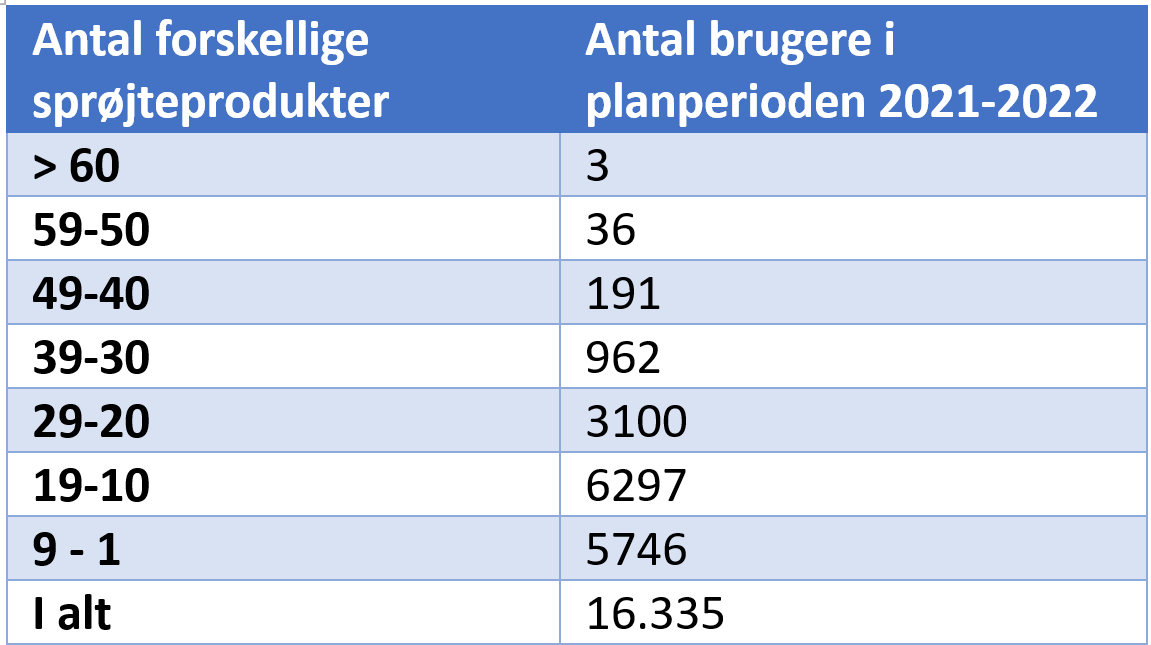 Hvad angår brugerne af kemiske sprøjteprodukter i Danmark, er der blandt de 16.335 jordbrugere, der har indberettet en eller flere pesticidsprøjtning i planperioden 2021-22, en gruppe på 1.192 jordejere (7,3%), der er afhængige af 30 eller flere forskellige midler. Topplaceringen udgøres af tre producenter med forbrug på henholdsvis 67, 63 og 61 forskellige giftmidler i løbet af en vækstsæson.