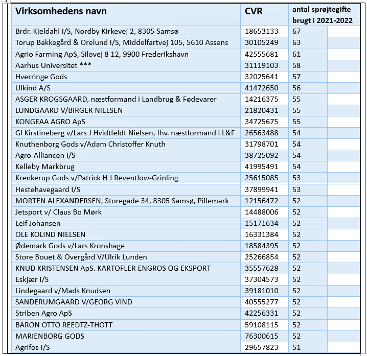 En række af landbrugets fremtrædende organisationsfolk bruger også løs af kemiske hjælpemidler med svineproducent Asger Krogsgaard, næstformand i Landbrug & Fødevarer, på en 8. plads med 55 sprøjtemidler og 98 sprøjteture, Lars Hvidtfeldt Nielsen, fhv. næstformand i Landbrug & Fødevarer, Gl. Kirstineberg, på en 11. plads med 54 sprøjtegifte og 96 sprøjtninger og svineproducent Per Bach Laursen på en 129. plads med 43 forskellige sprøjteprodukter og 62 ture med marksprøjten om året. Bach Laursen er også Venstre-borgmester i Vesthimmerlands Kommune, men han gør en dyd ud af selv at køre med marksprøjten, når kartoflerne skal have en omgang.