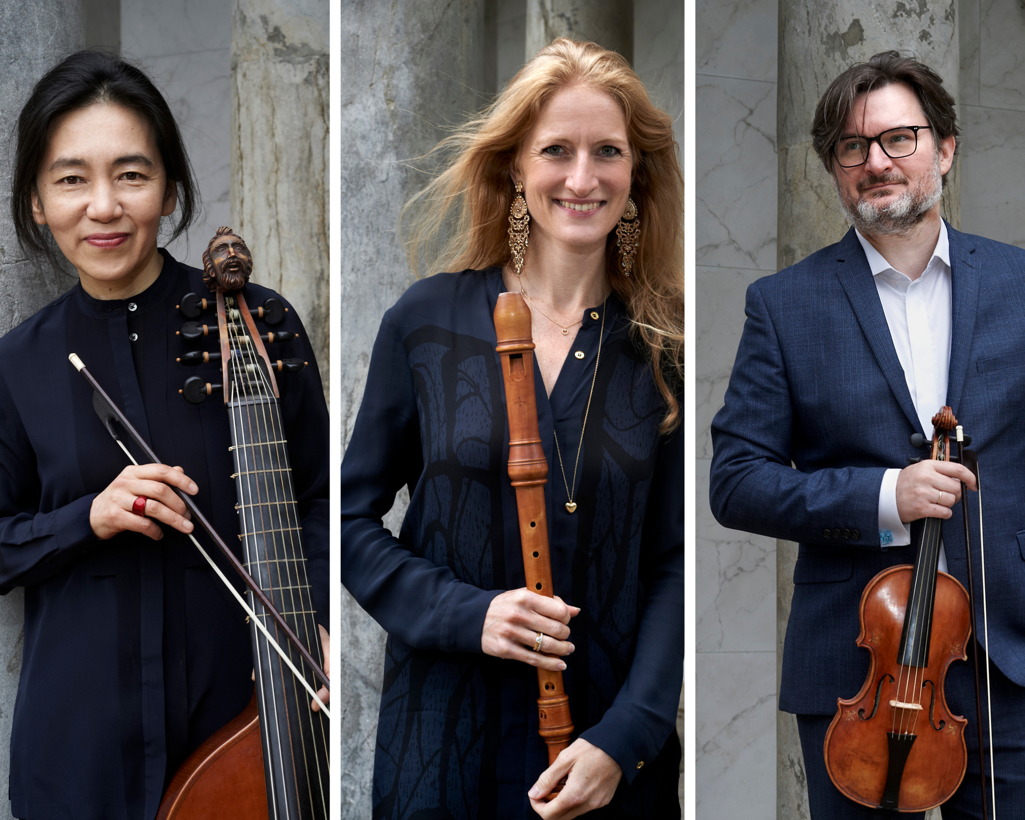 Copenhagen Baroque Festivals kreative producent Trine Heide fortæller, ledsaget af den internationale barok-trio på scenen: