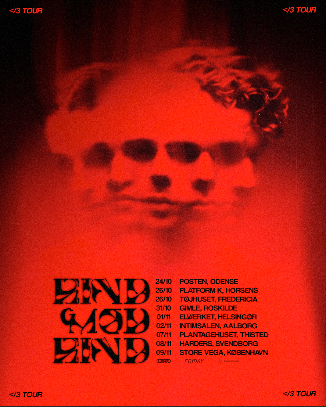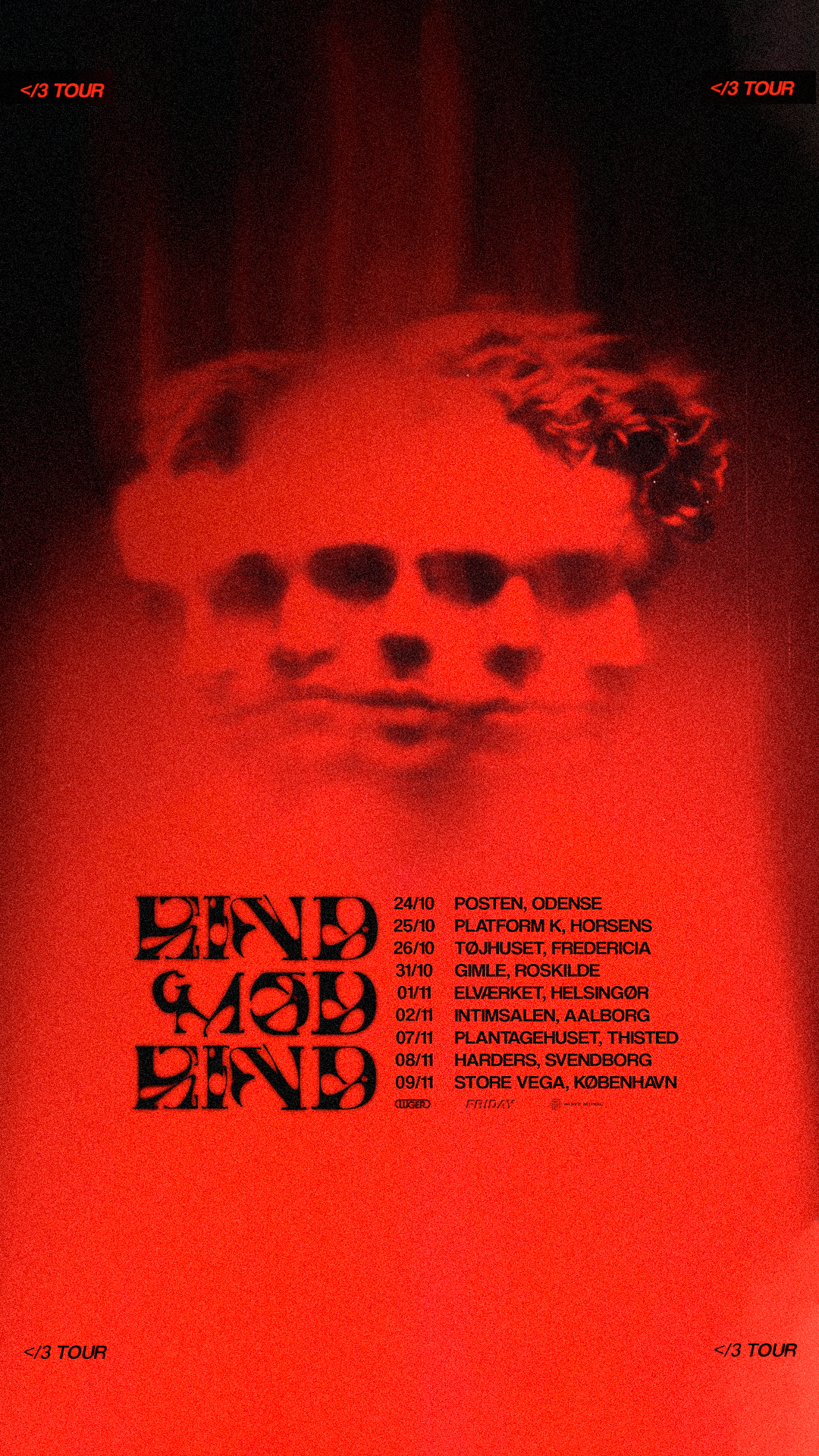 Tilbage i oktober 2023 annoncerede Kind mod Kind, at de ville spille to headliner-koncerter i løbet af foråret i henholdsvis Pumpehuset i København og på Voxhall i Aarhus. Efter kort tid blev koncerten i Pumpehuset meldt udsolgt, og der blev annonceret en ekstra koncert, som også er meldt udsolgt. Forårskoncerterne finder sted i marts-måned og nu annonceres det, at Kind mod Kind, med deres debutalbum ”</3” i ryggen, drager på en omfattende danmarksturné i efteråret 2024.