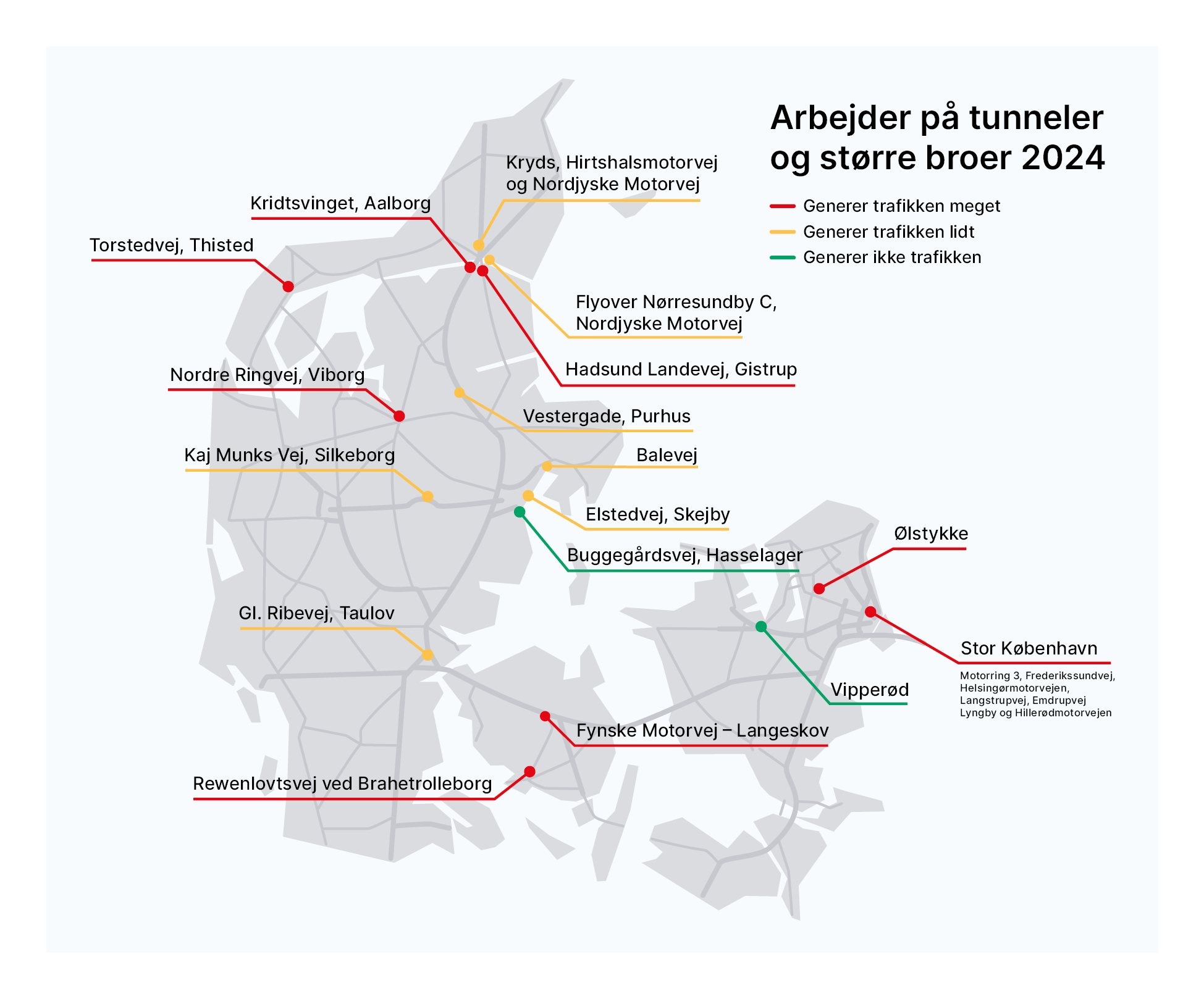 Vejdirektoratet planlægger at gennemføre omkring 100 store og mindre vedligeholdelsesarbejder på bygværker i 2024. Heraf skal 21 større broer og tunneler have en opgradering, så de kan holde mange år frem i tiden.