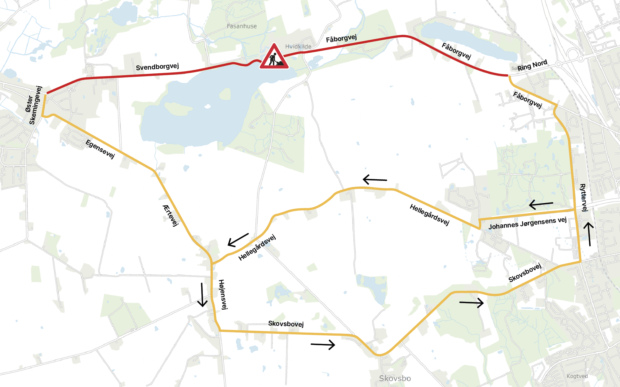 Trafikanter, der skal benytte Fåborgvej de pågældende dage, vil blive ledt syd om Hvidkilde Sø. De der skal vestpå mod Svendborg bliver ledt ned til Skovsbovej, mens trafikanterne, der skal mod Ollerup, skal køre ad Hellegårdsvej. Der er forskellige omkørselsruter for de øst- og vestgående trafikanter for at fordele trafikken på de små veje.