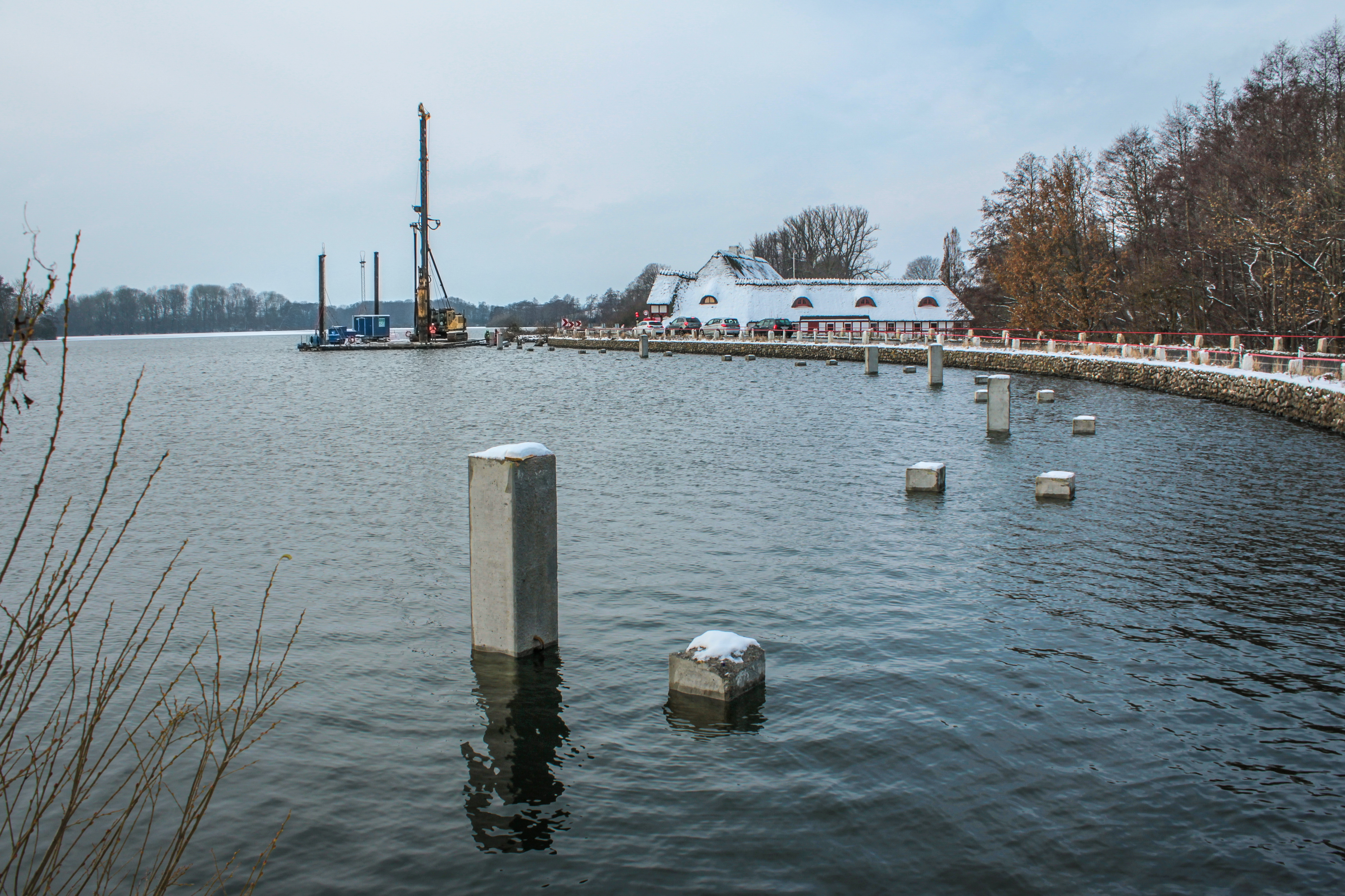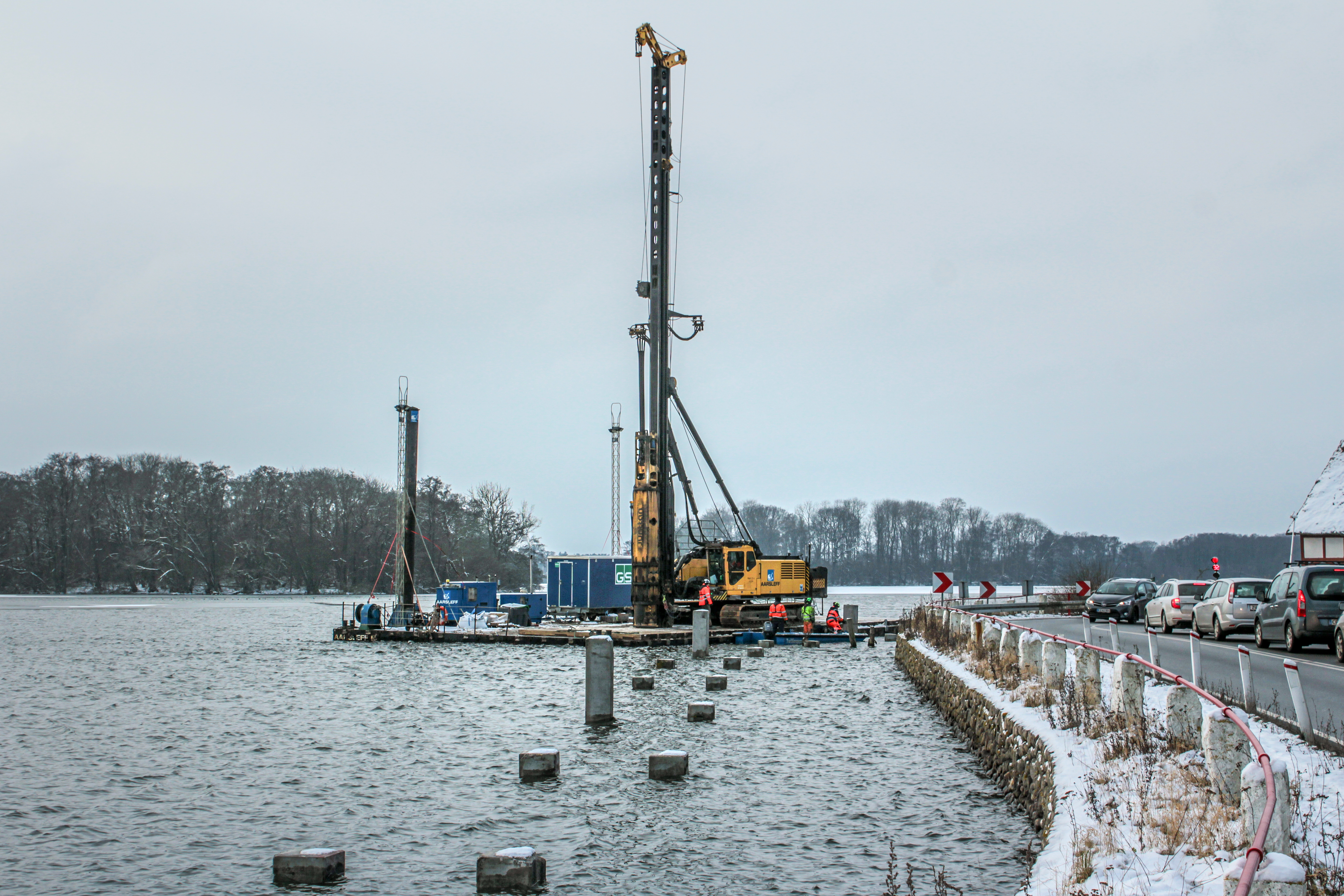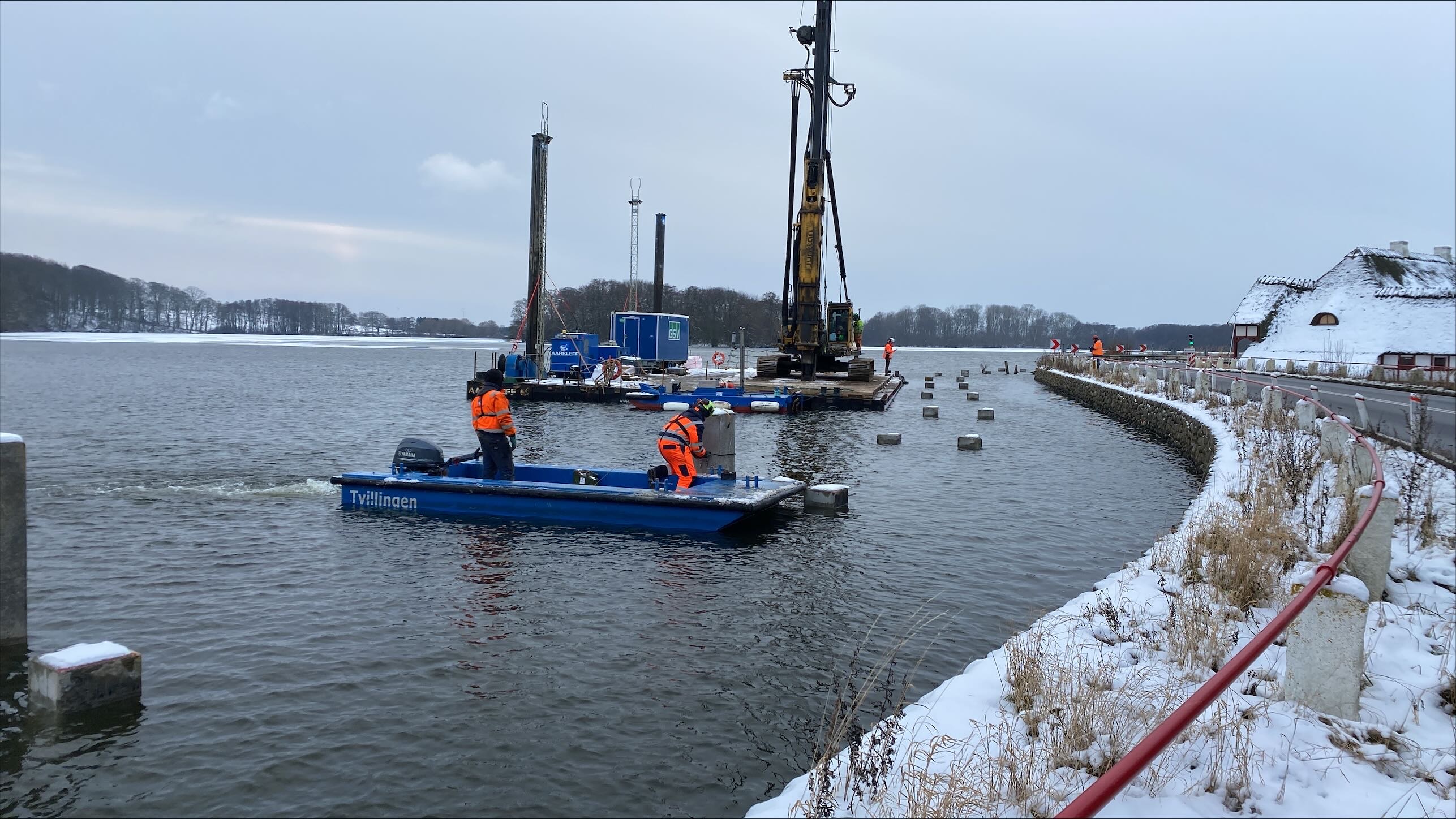 I næste uge ankommer cykelbroen, og så begynder arbejdet med at montere den på de jernbetonpæle, som lige nu stikker op over vandets overflade i Hvidkilde Sø.