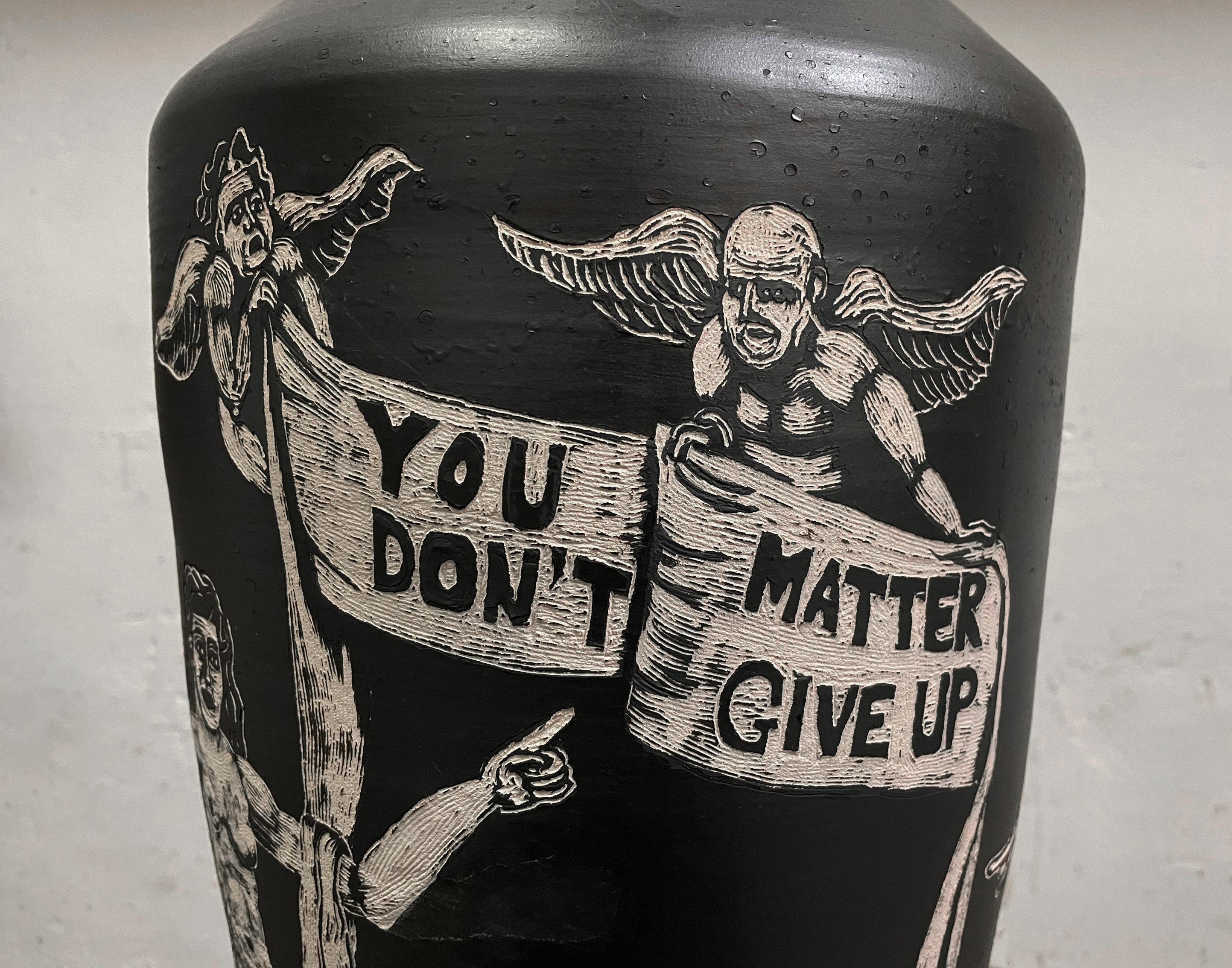 I sin billedkunstneriske praksis er Niels Pugholm (f. 1983) optaget af, hvordan man skaber fortællinger, over de seneste år primært med keramikken som medie. Med afsæt i moderfortællingen over dem alle, udforsker Pugholm spørgsmålet om menneskets rolle, magt og skæbne i undergangens evige kredsløb.