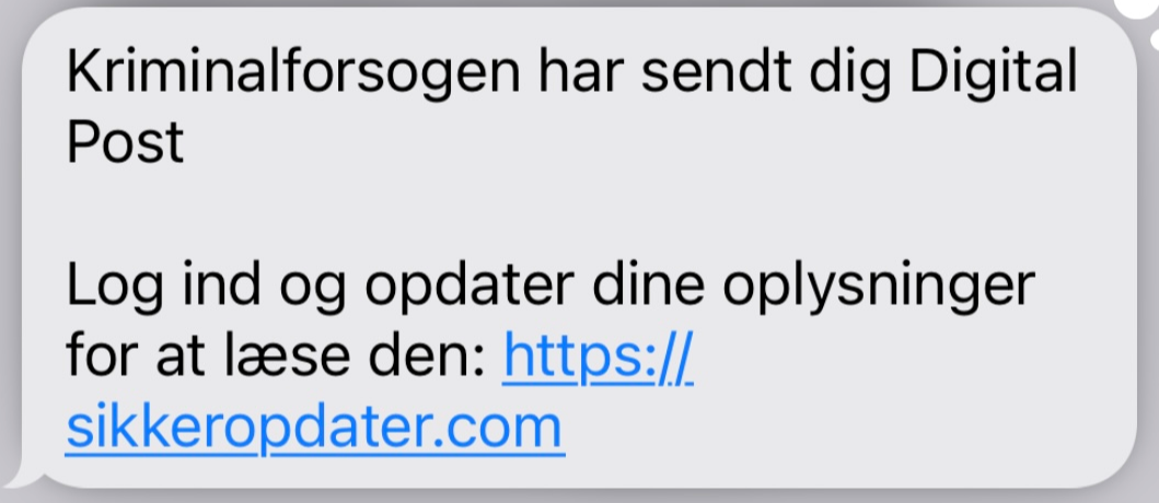 I øjeblikket er der sms’er i omløb om, at der er besked fra kriminalforsorgen i e-boks. Men det er et svindelforsøg, og du skal IKKE klikke på linket. I stedet skal du straks slette beskeden. Beskederne henviser blandt andet til sikkeropdater.com samt MitIDinformering.com.
