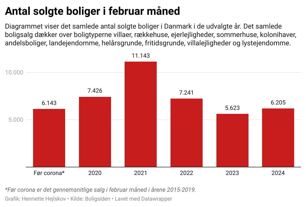 ”Samtidig kan vi se, at der blev solgt én procent flere boliger i februar i år, end der i gennemsnit blev solgt i samme måned i perioden før de gyldne coronaår, som er den seneste normal på boligmarkedet, vi kan sammenligne med. Det er begge faktorer, som gør, at bolighandlen overordnet set synes at være kommet fint fra start i 2024.”