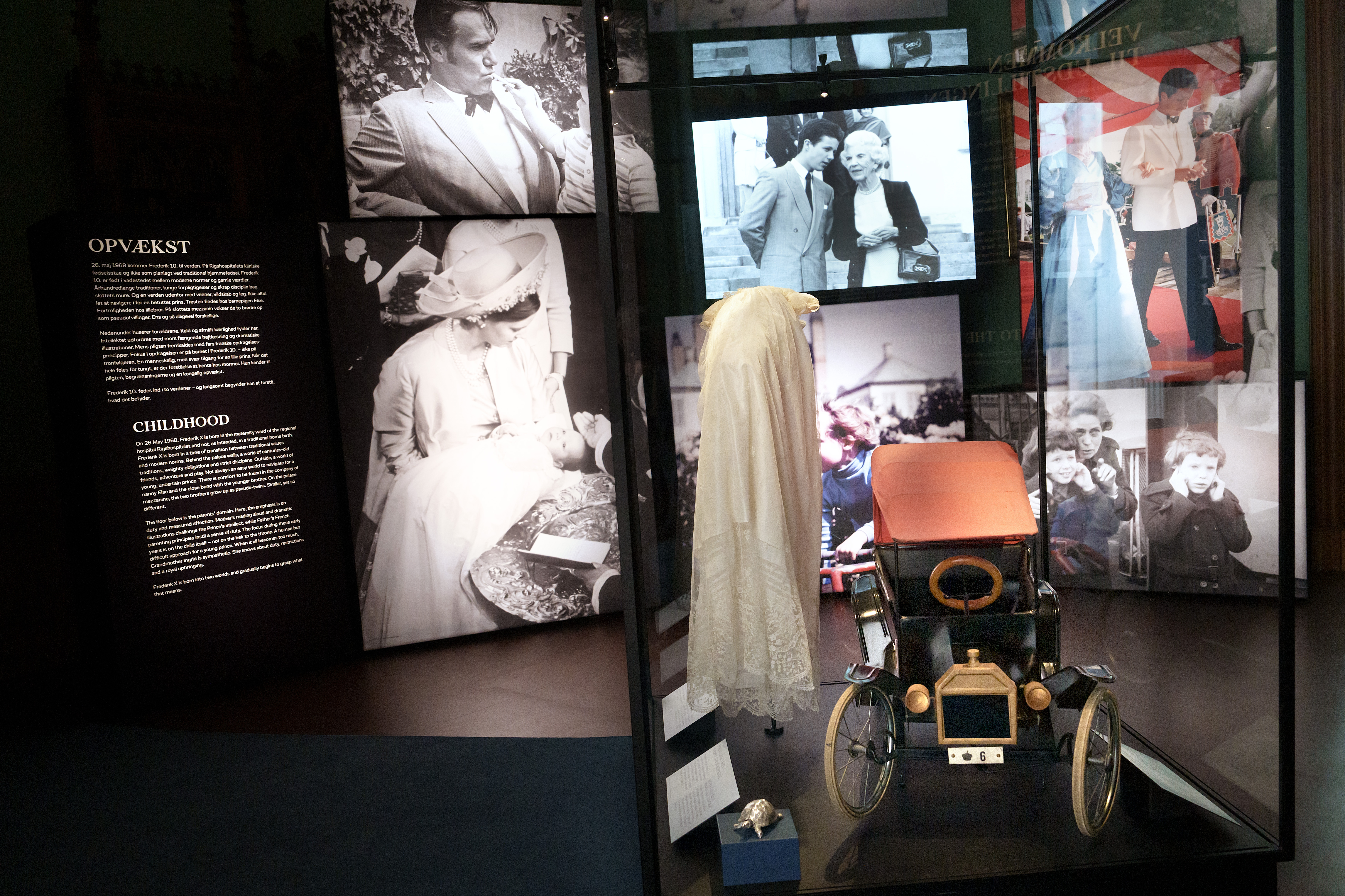 Der er dåbskjolen båret af en næste nyfødt prins til barnedåben i Holmens Kirke i 1968. Der er en bordklokken, som minder Kongen om Dronning Ingrid og hans mange besøg i Kancellihuset hos sin mormor. Her er klassikeren Ringenes Herre af Tolkien med tilhørende illustrationer malet af Dronning Margrethe, som vidner om særlige øjeblikke, hvor mor læste højt for sine sønner. En ternet skoletaske båret til 1. skole dag på Krebs Skole, en studenterhue med hakker i kanten, frømandsudstyr, en slidt og forvasket maratontrøje, en fem meter lang bjælke med tilnavnet Maren, som markerer afslutningen på Frømandsuddannelsen, en uniform og Dronning Marys brudekjole – og så er der en helt særlig gave givet til Mary Donaldson, først gang den daværende kronprins mødte Mary Donaldson i Australien efter OL - og som efter sigende passede som fod i hose.