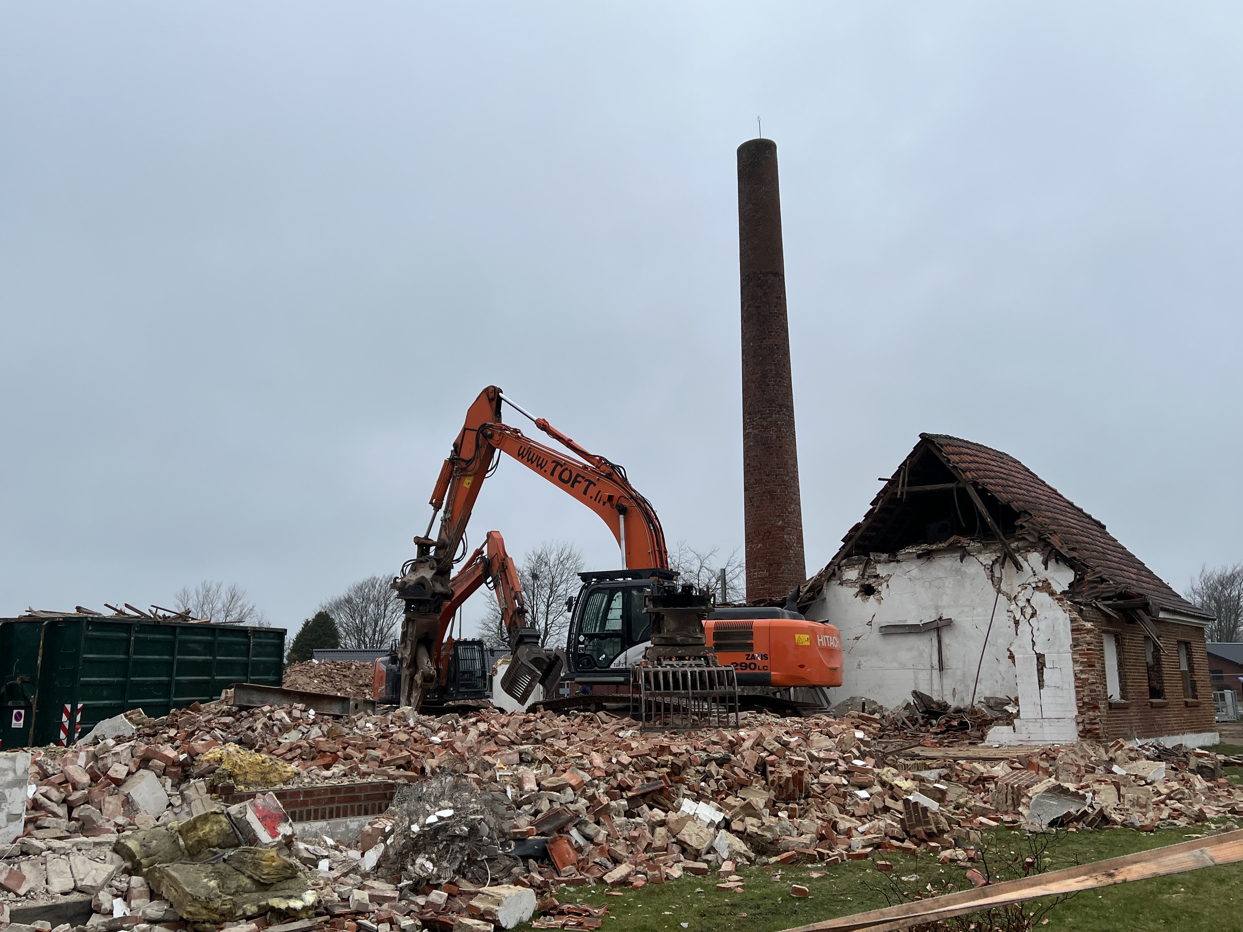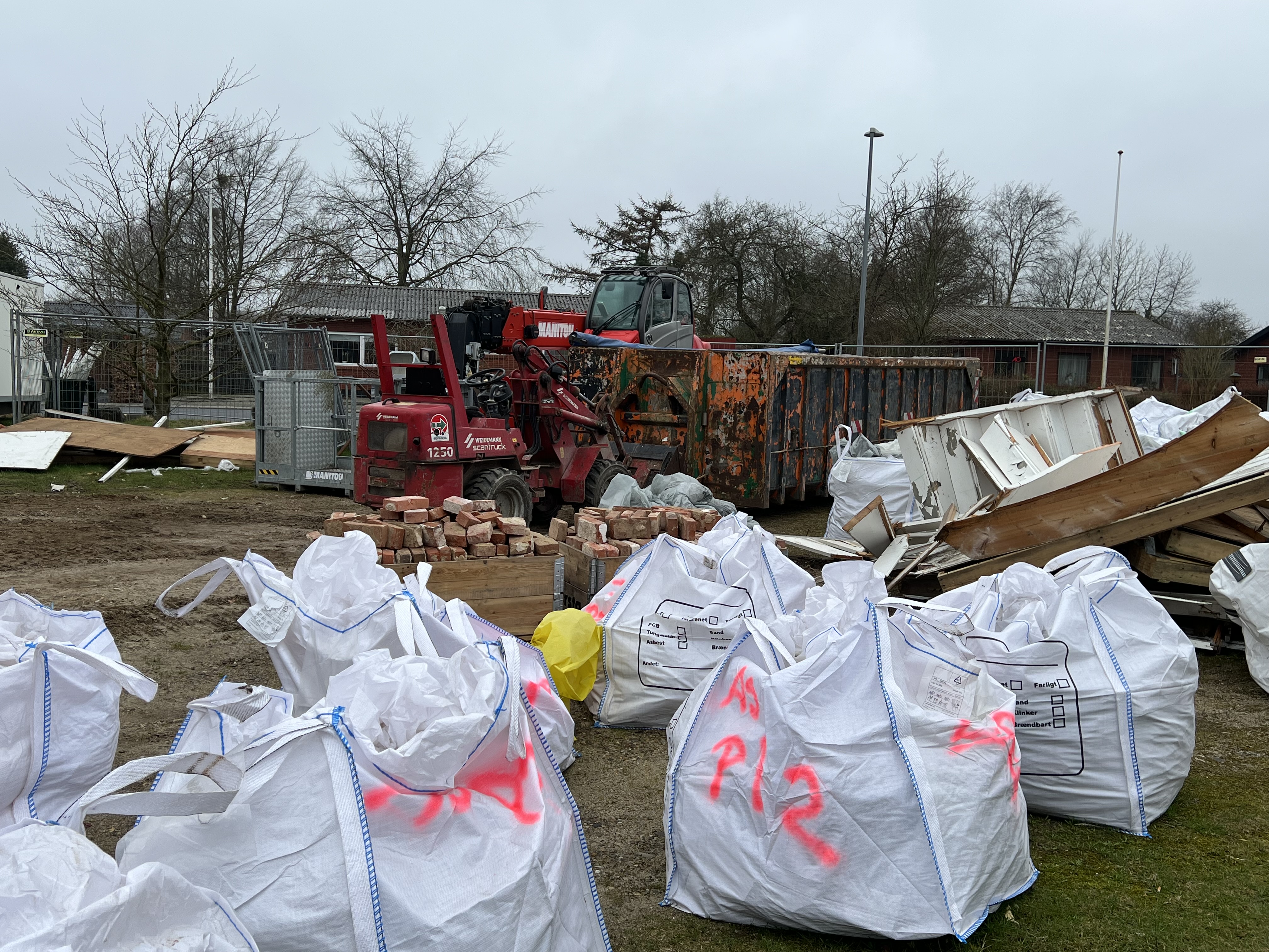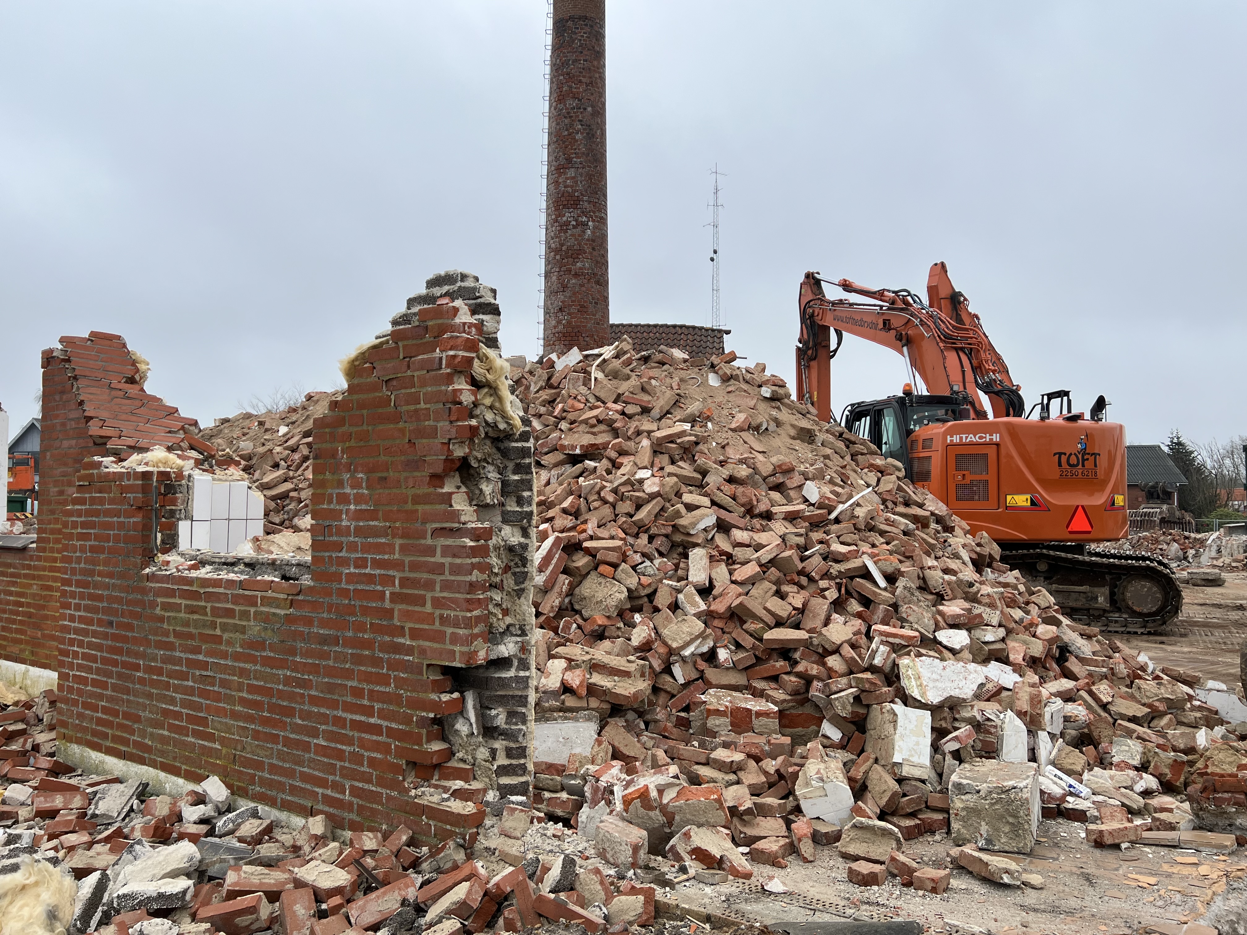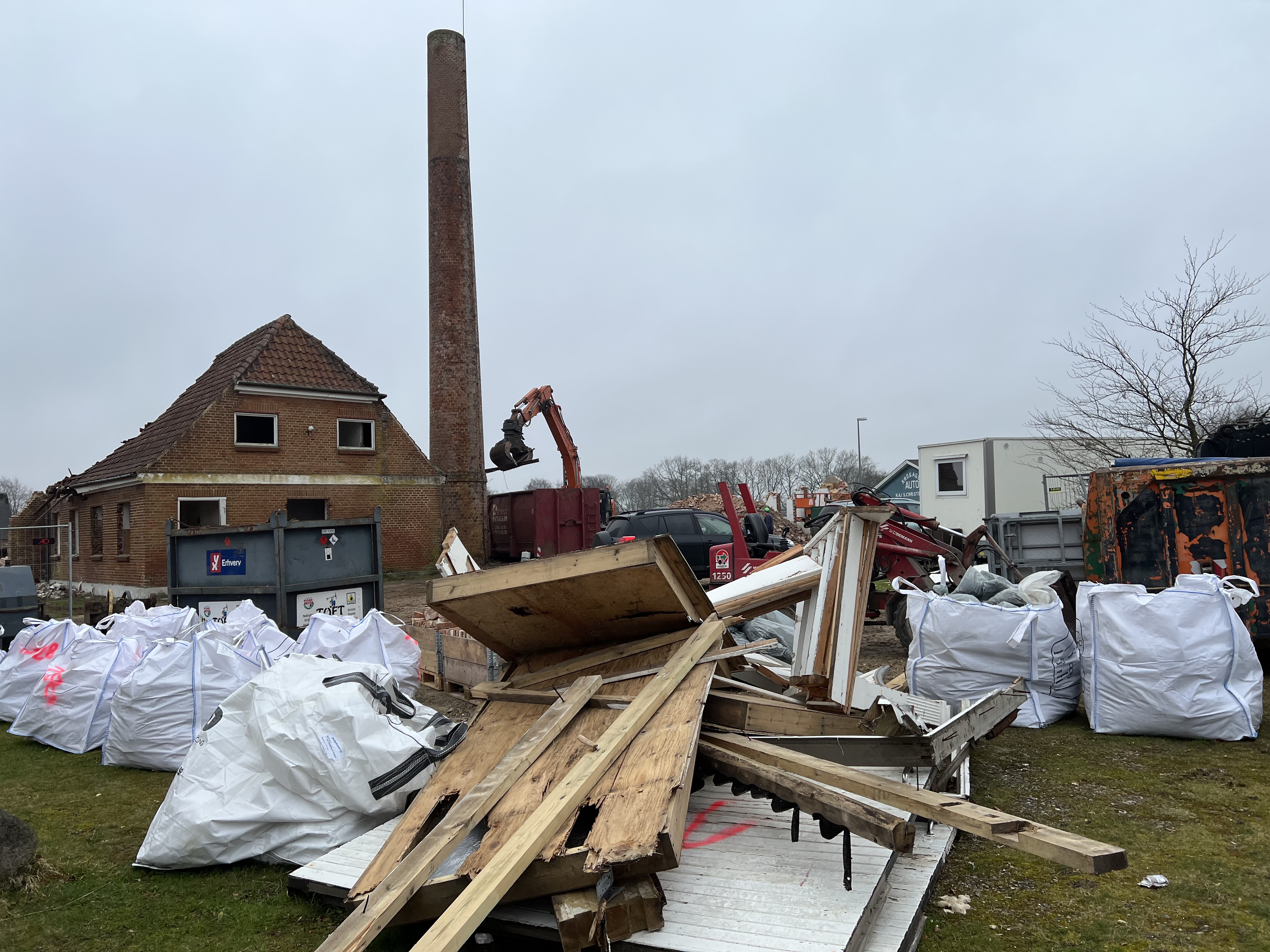 Fx genanvendes alle mursten, undtagen dem i skorstenen, da de er blevet solgt til en virksomhed, som renser stenene og videresælger dem.