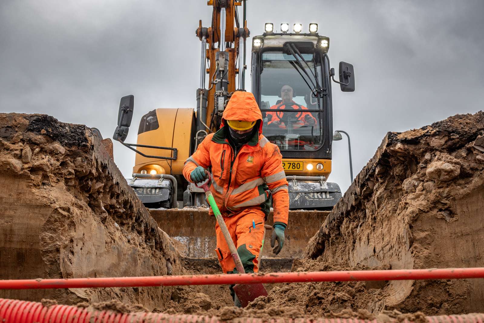 Det er med huen over hjelmen og med halsedissen godt oppe om hagen, at anlægsarbejdere for tiden trodser vinterkulden.