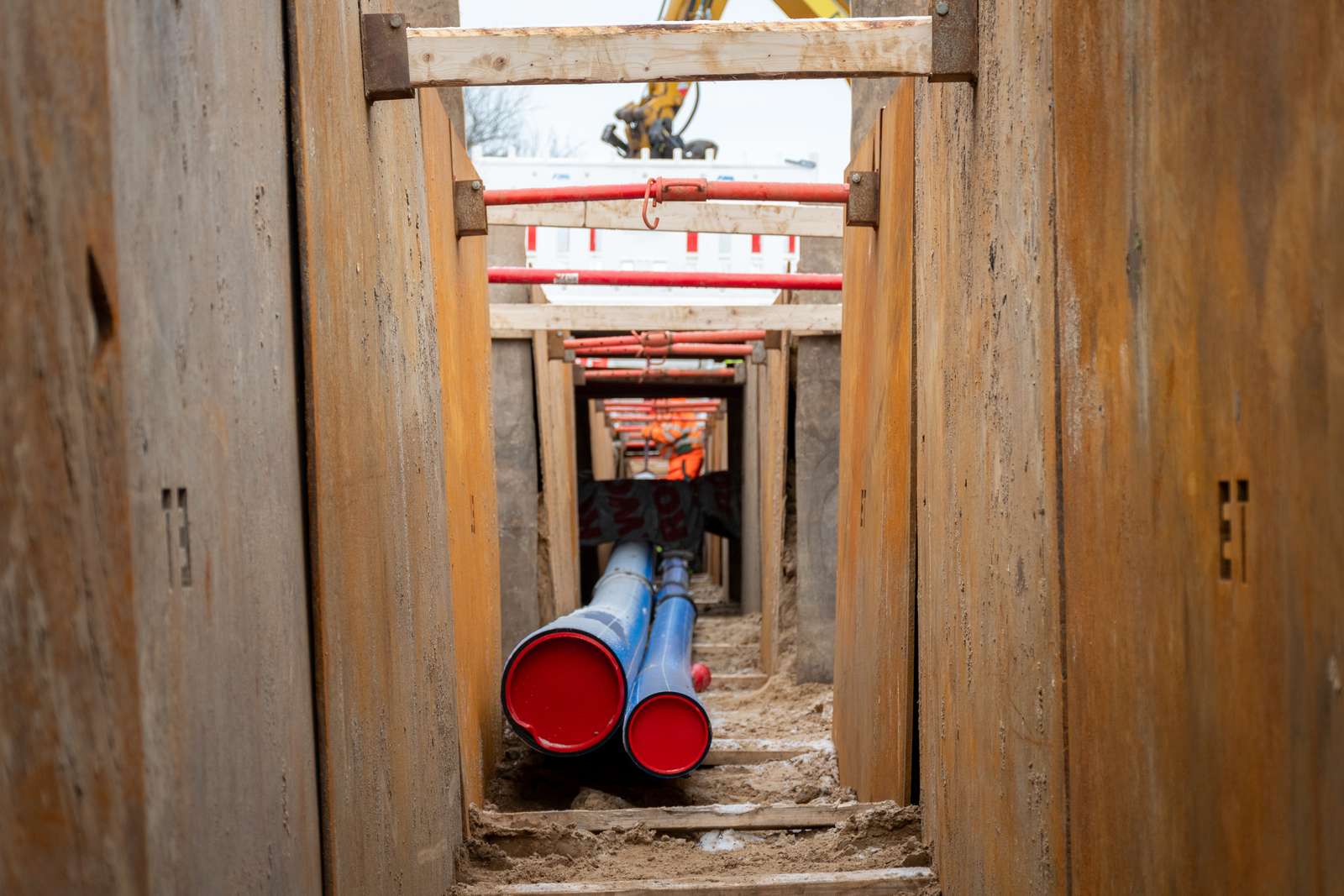 Han forklarer, at arbejdet med vandledningerne, der erstatter gamle ledninger i støbejern, kommer til at ligge nederst i tracéet i en dybde på 180-200 cm, imens fjernvarmeledningerne ligger i 70-140 centimeters dybde.