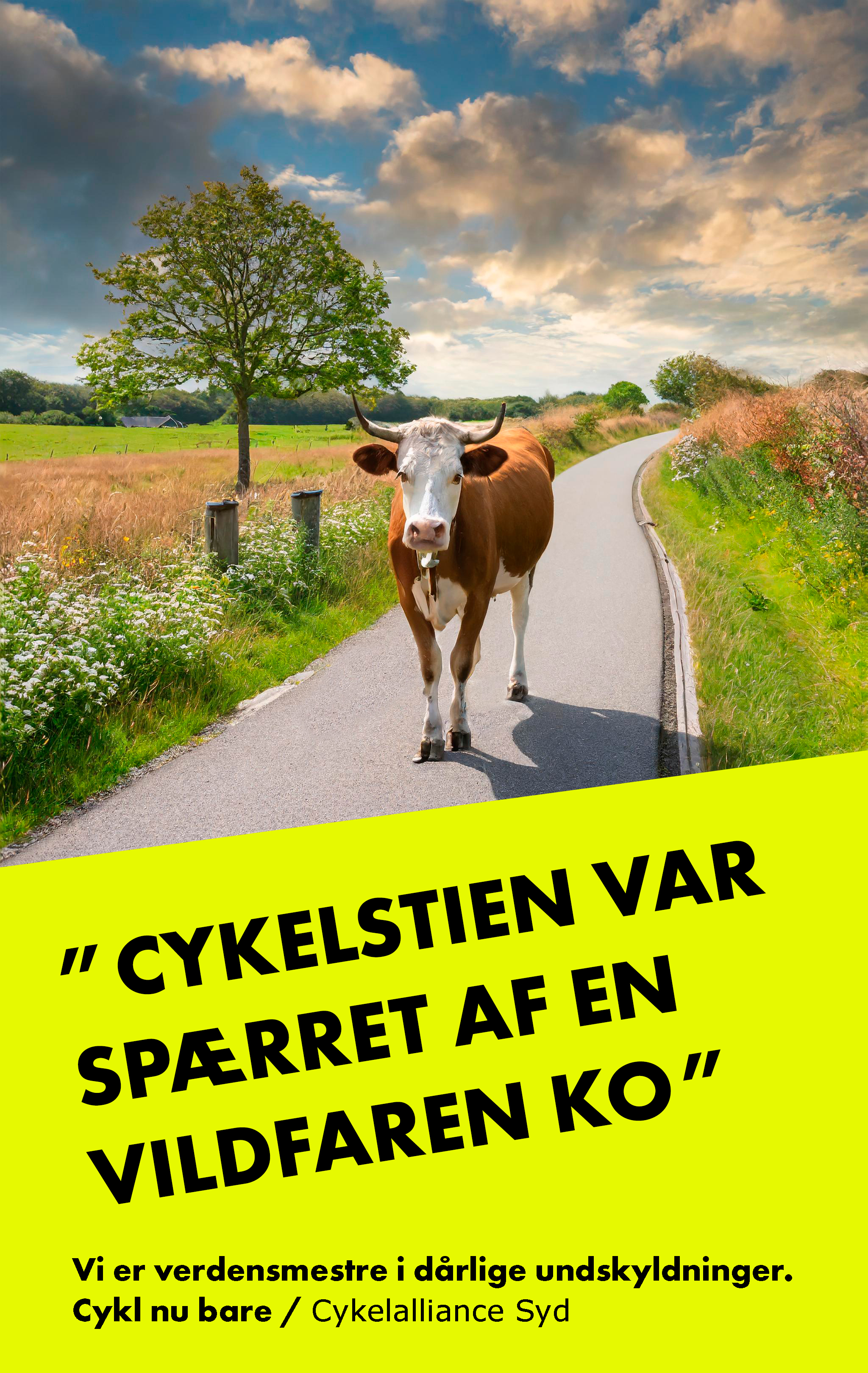 Storken Clyde, en vildfaren ko og bunden af Vidåen får i en ny humoristisk cykelkampagne skylden for, at cyklen blev i skuret, mens bilen trillede ud af indkørslen.