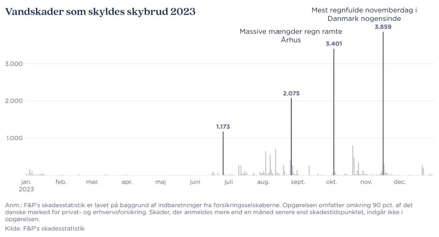 F&P opgør for første gang skader efter voldsomt vejr, så man kan se, hvilke dage, skaderne rammer. Og skaderne efter nedbør i 2023 samler sig tydeligt om fire kraftige skybrud. Men især en dag i oktober, hvor Aarhus blev ramt af massive regnmængder, og den mest regnfulde novemberdag i Danmark nogensinde, der var skyld i næsten 4.000 skader, stikker ud. Særligt fordi de lå uden for sæsonen for skybrud, som slutter i september.