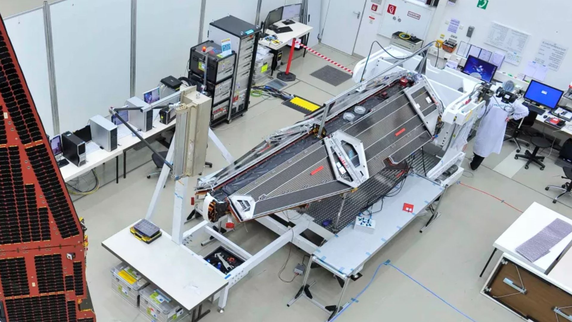 Swarm-satellit under opbygning i laboratoriet. Foto: ESA/Airbus Industries.