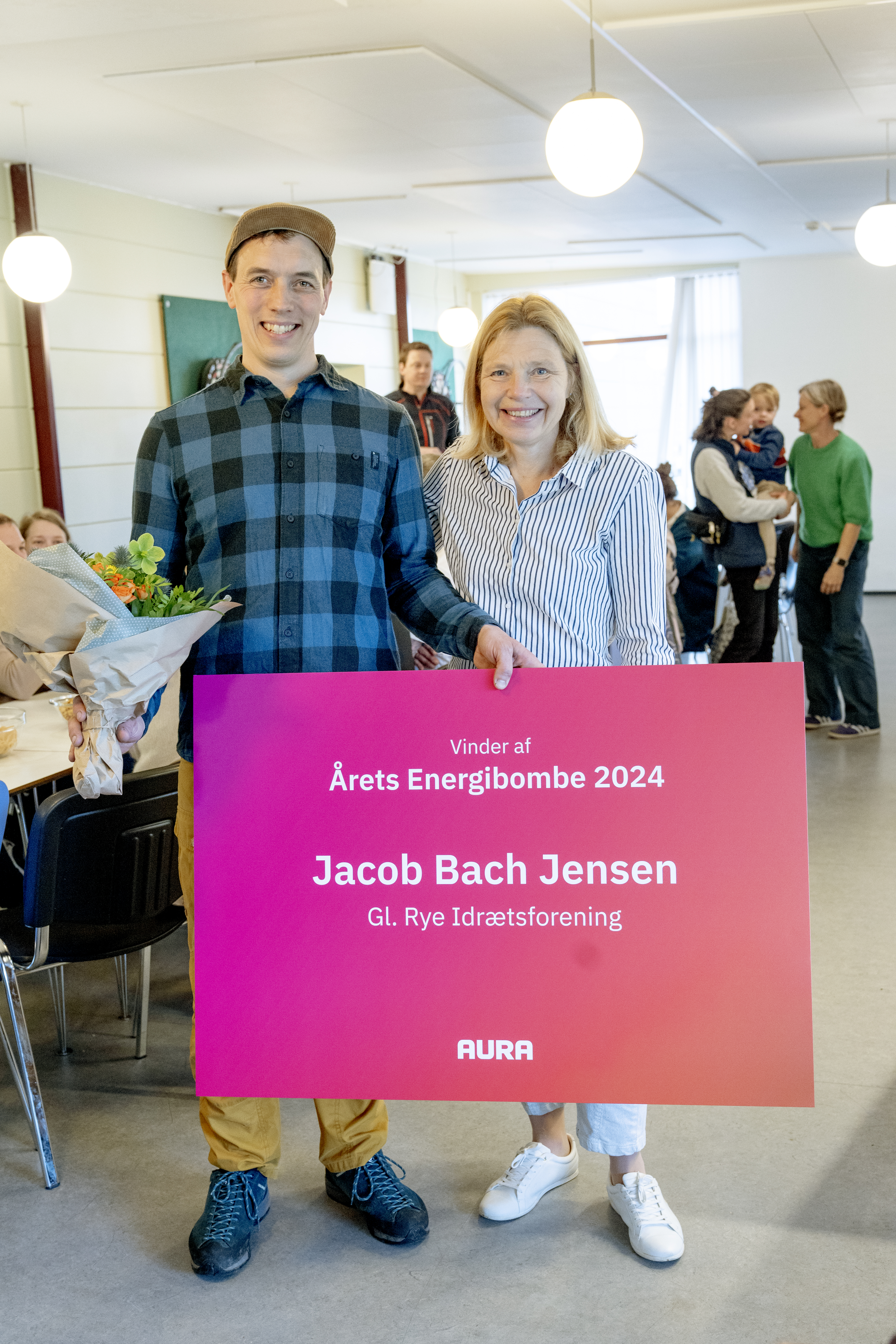 Med 32 procent af stemmerne er Jacob Bach Jensen fra Gl. Rye Idrætsforening vinder af Årets Energibombe. En pris som AURA hvert år uddeler til en frivillig i en lokal forening.