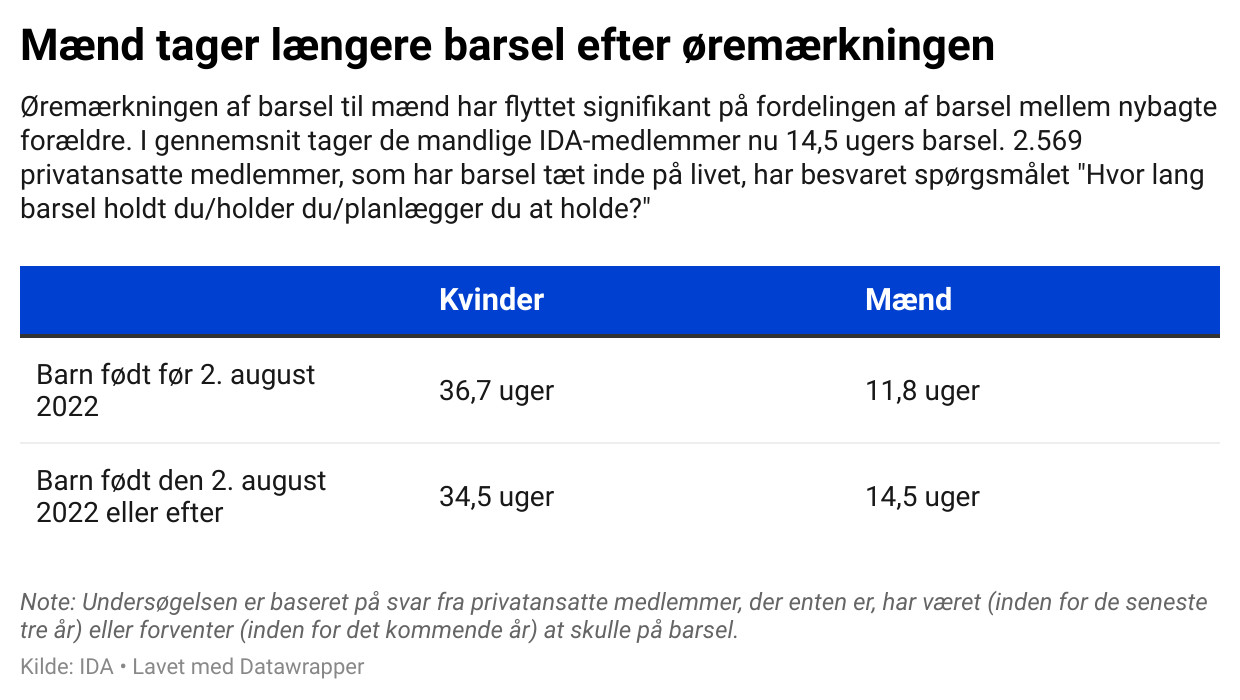 Før øremærkningen tog knap hver femte mand mellem 0-8 ugers barsel. Det gælder blot for fem pct. nu. I den anden ende af spektret var det blot fem pct. af fædrene, der tog mere end 24 ugers barsel før den 2. august 2022. Det tal er nu steget til 13 pct. Tilsvarende tager kvinderne nu kortere barsel. Hvor 28 pct. af kvinderne tog mere end 42 uger før øremærkningen, er det nu 16 pct., som tager 42 uger eller mere.
